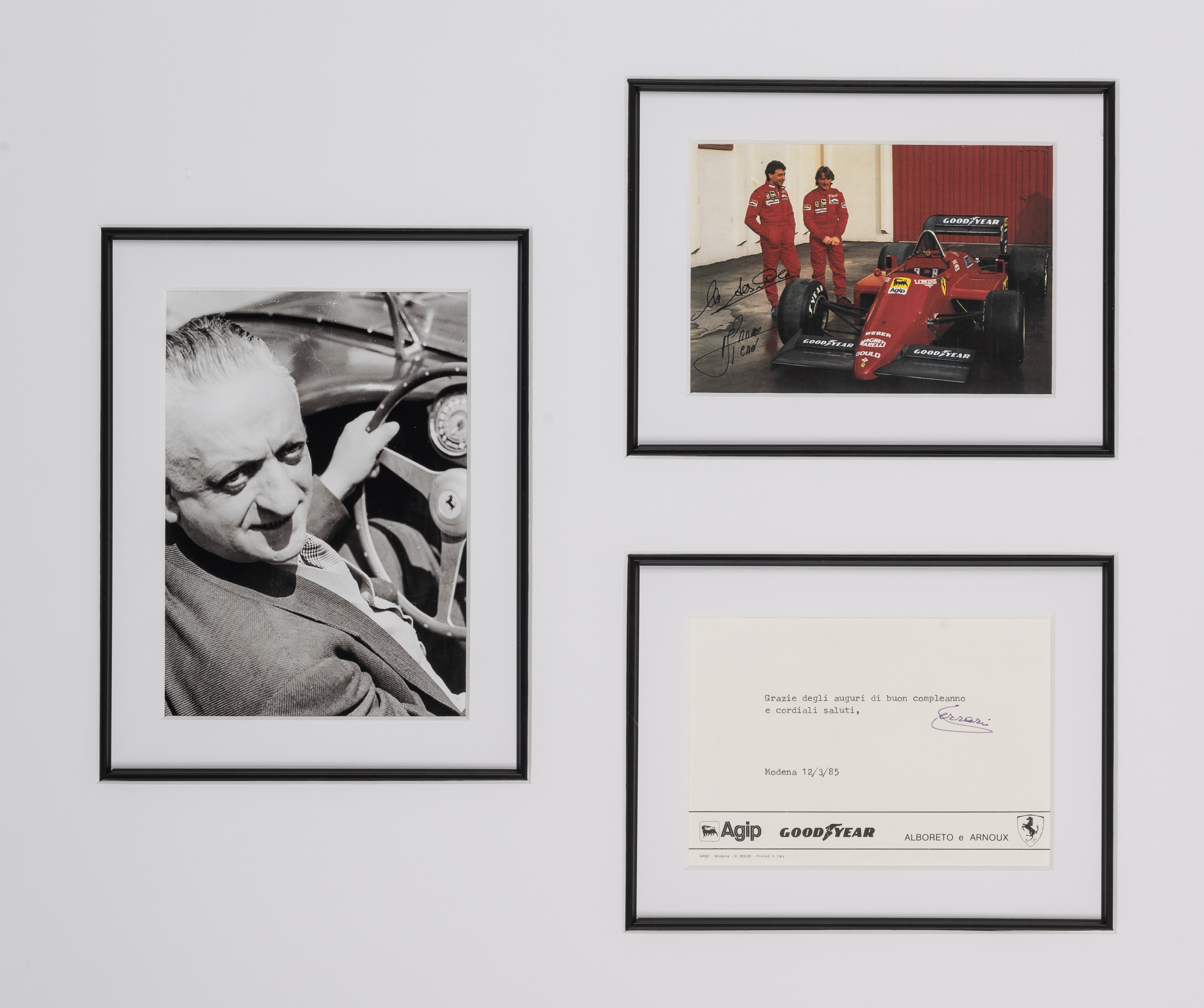 Enzo Ferrari signed compliment slip display, featuring a printed colour image of Enzo Ferrari with a F1 car flanked by a b&w image of Enzo Ferrari and a Agip, Goodyear, Alboreto e Arnoux compliment slip signed in pen, mounted, glazed and framed, overall 57 by 63cm., reverse bearing Rare Memorabilia COA All glass will be removed from framed and glazed items prior to posting and may result in delays to shipping your items. (This service is included in the cost of postage and packing). We can also totally remove all framing and mounts upon request to reduce shipping costs. Alternatively, lots can be collected in person by prior appointment from NN8 1RT.