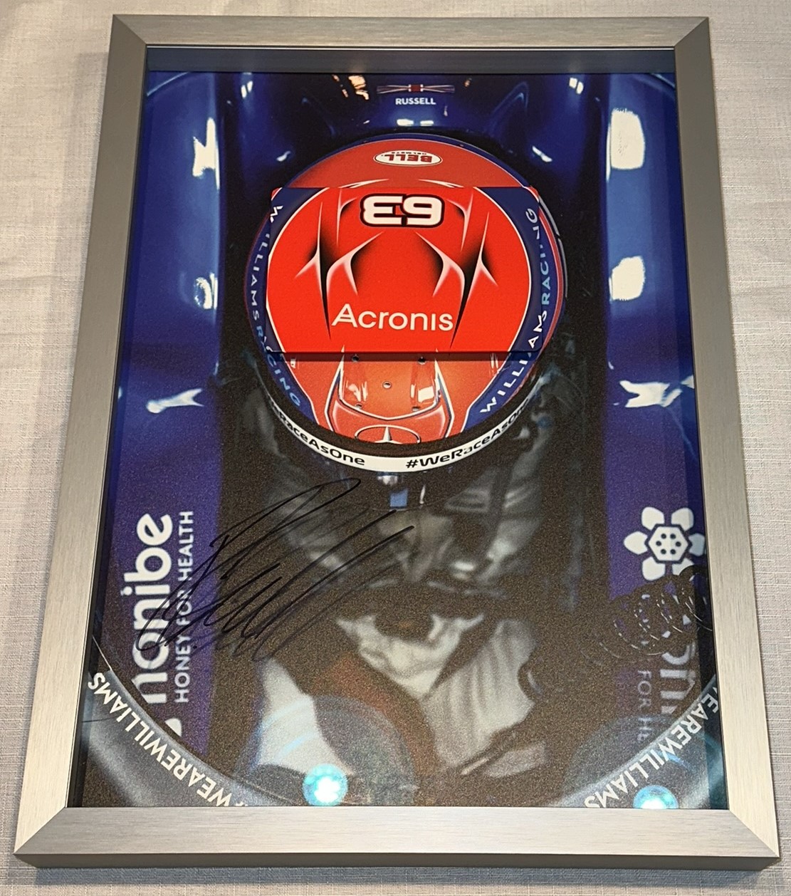 George Russell (UK) signed limited edition Williams 2020 framed replica helmet print, including a part of his helmet metal plate in the frame. Signed with black sharpie. Extremely rare and limited edition. Comes with Certificate of Authenticity, (2)