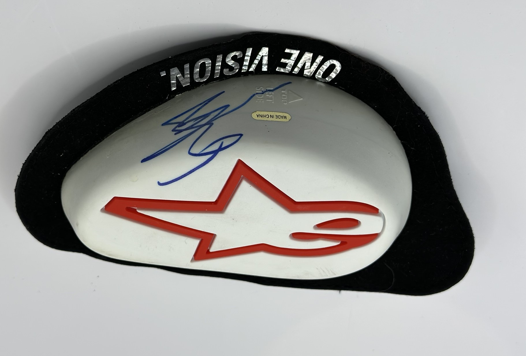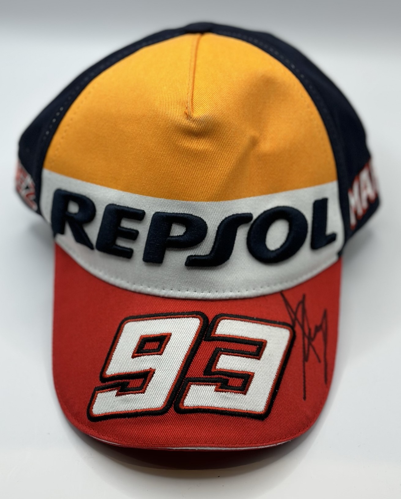 Marc Marquez (Spain) collection (2013, 2014, 2016, 2017, 2018, 2019 Moto GP World Champion), includes official Repsol Honda Marc Marquez replica racing cap with #93, signed on peak with black sharpie; Alpinestars Moto GP white slider, same brand as he uses, signed with black sharpie and action 8 by 12in. Repsol Honda Moto GP photo, showing the white Alpinestars sliders, signed with black sharpie to top left of photo. Also includes Certificate of Authenticity and photo proof of signing, (4)