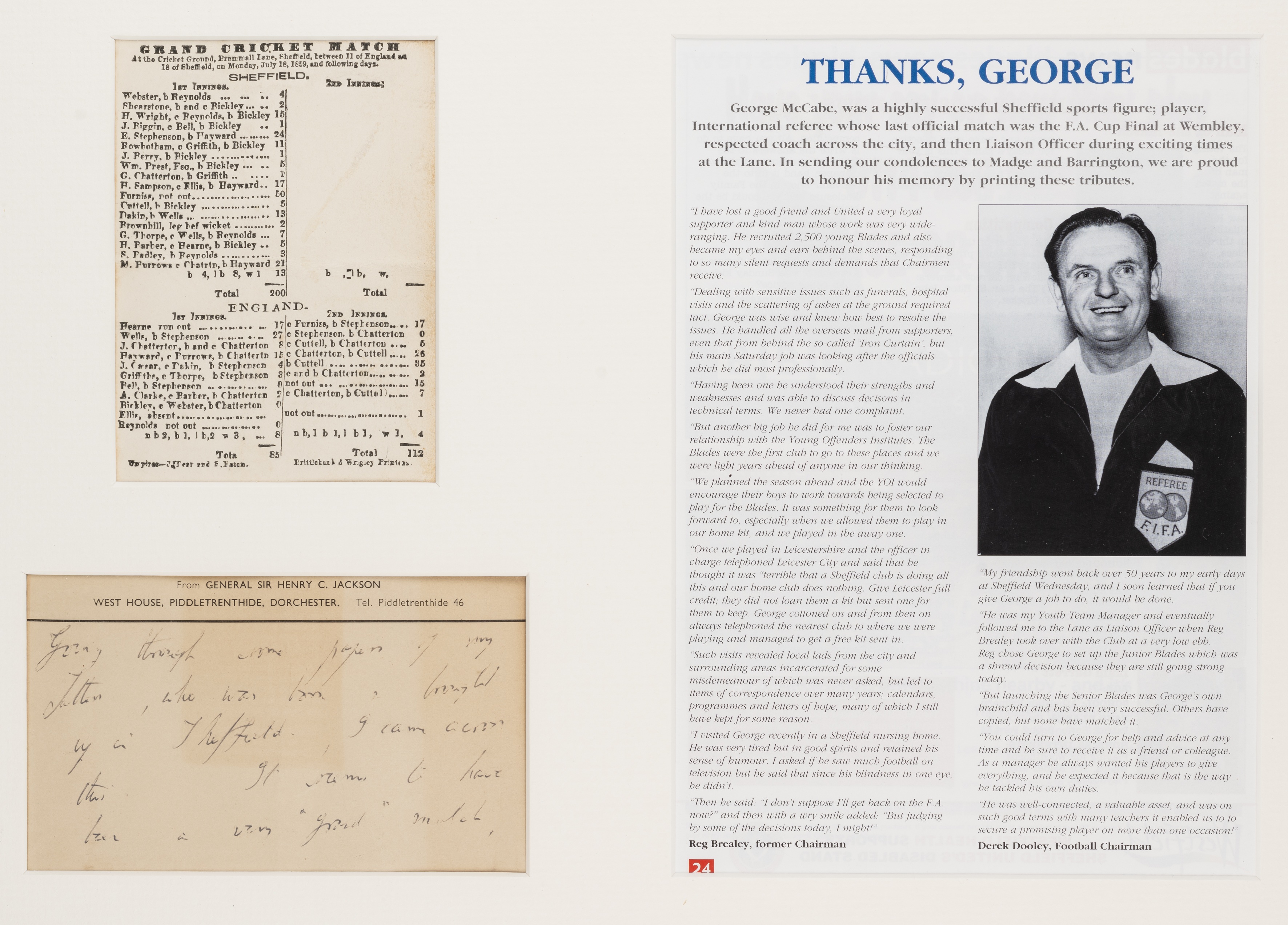 A rare cricket scorecard for the Grand Cricket Match between Sheffield and England at Bramall Lane, Sheffield on Monday, July 18th 1859, the card, which comes with a letter of provenance, is one of the earliest documents concerned with the historic stadium that we are aware of and is believed to have been of those printed and sold outside the enclosure by local entrepreneur Billy Whitham, a practice he continued for many years until the ground committee noted it was potentially a valuable source of income. There are signs of a horizontal fold and some slight staining to the upper right hand side of the card.