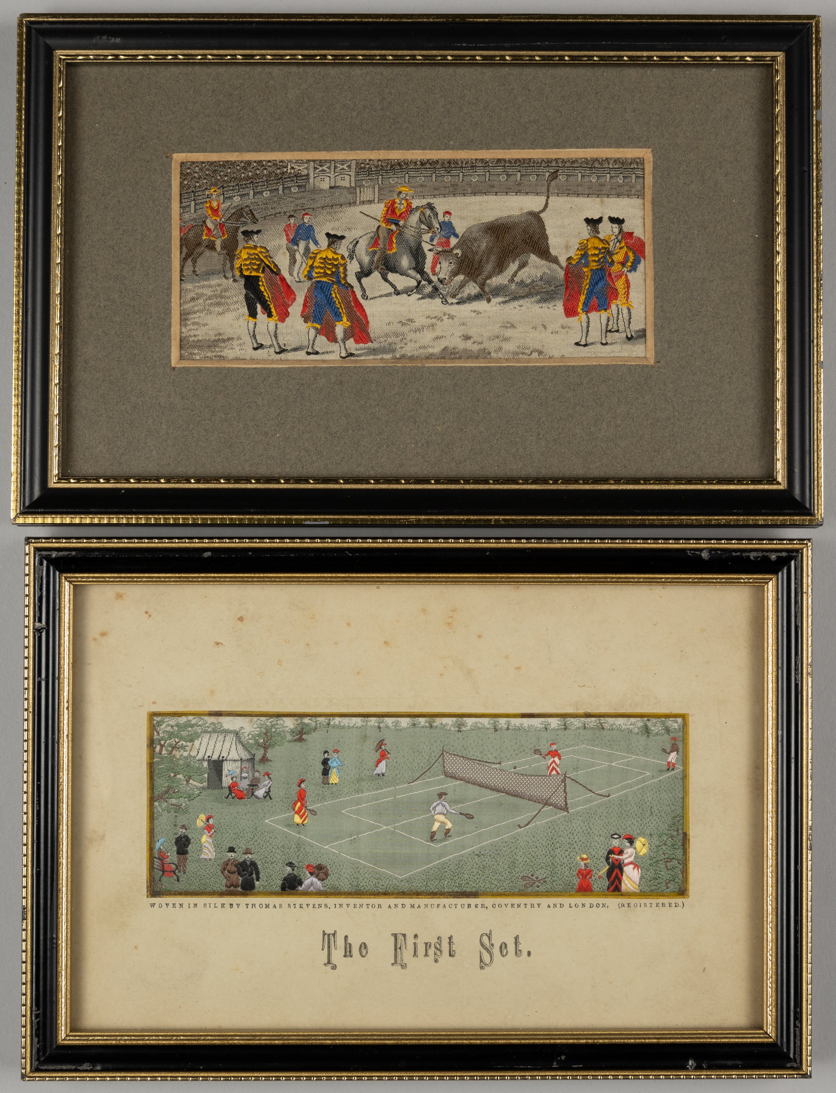 Two Victorian silk Stevengraphs, comprising The First Set, 2 by 6in. and Spanish Bull Fighter, 2 by 6in. both framed (2)