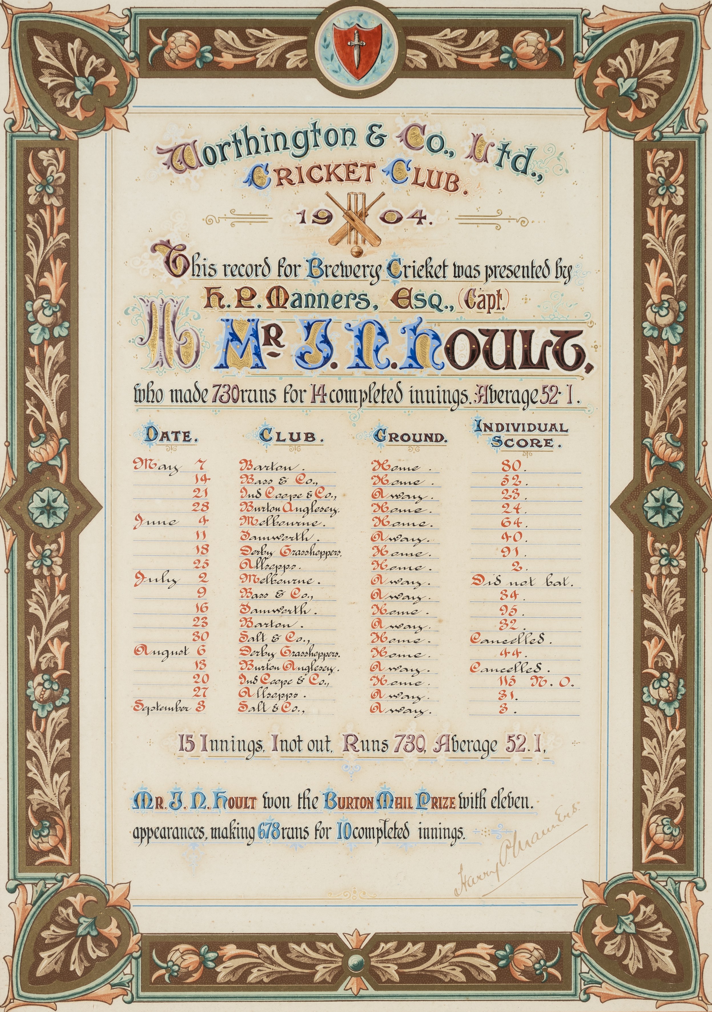 Worthington & Co. Ltd Brewery Cricket Club illuminated address awarded to Mr J N Hoult, dated 1904, The colour illustrated address for the record bre