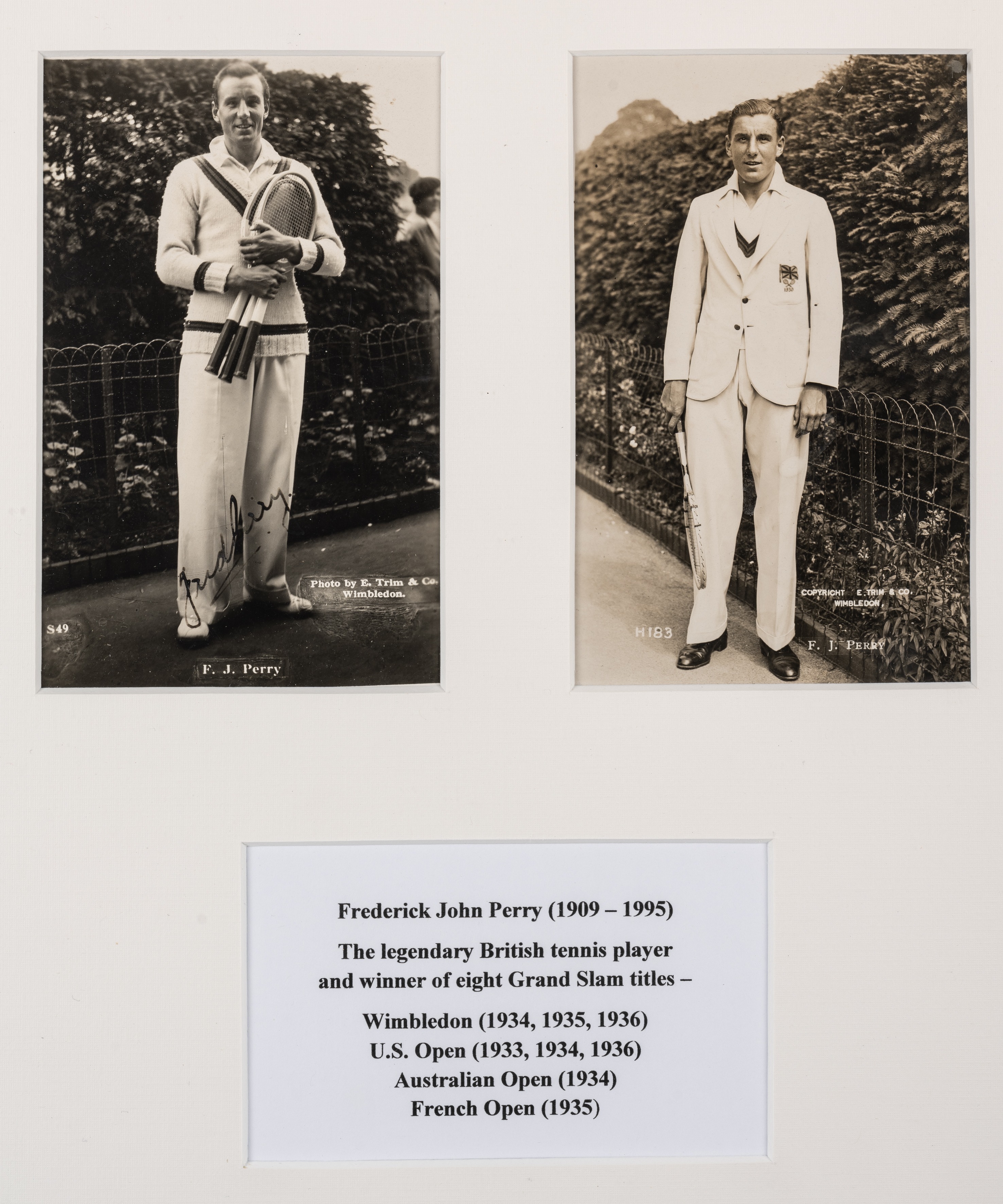 Two tennis b&w photographs of Fred Perry with typed tennis record legend below, the two photographs mounted above legend, each photographs bearing name and copyright details, featuring Fred Perry in tennis uniform, glazed and framed, overall 34 by 30cm. Good condition All glass will be removed from framed and glazed items prior to posting and may result in delays to shipping your items. (This service is included in the cost of postage and packing). We can also totally remove all framing and mounts upon request to reduce shipping costs. Alternatively, lots can be collected in person by prior appointment from NN8 1RT.