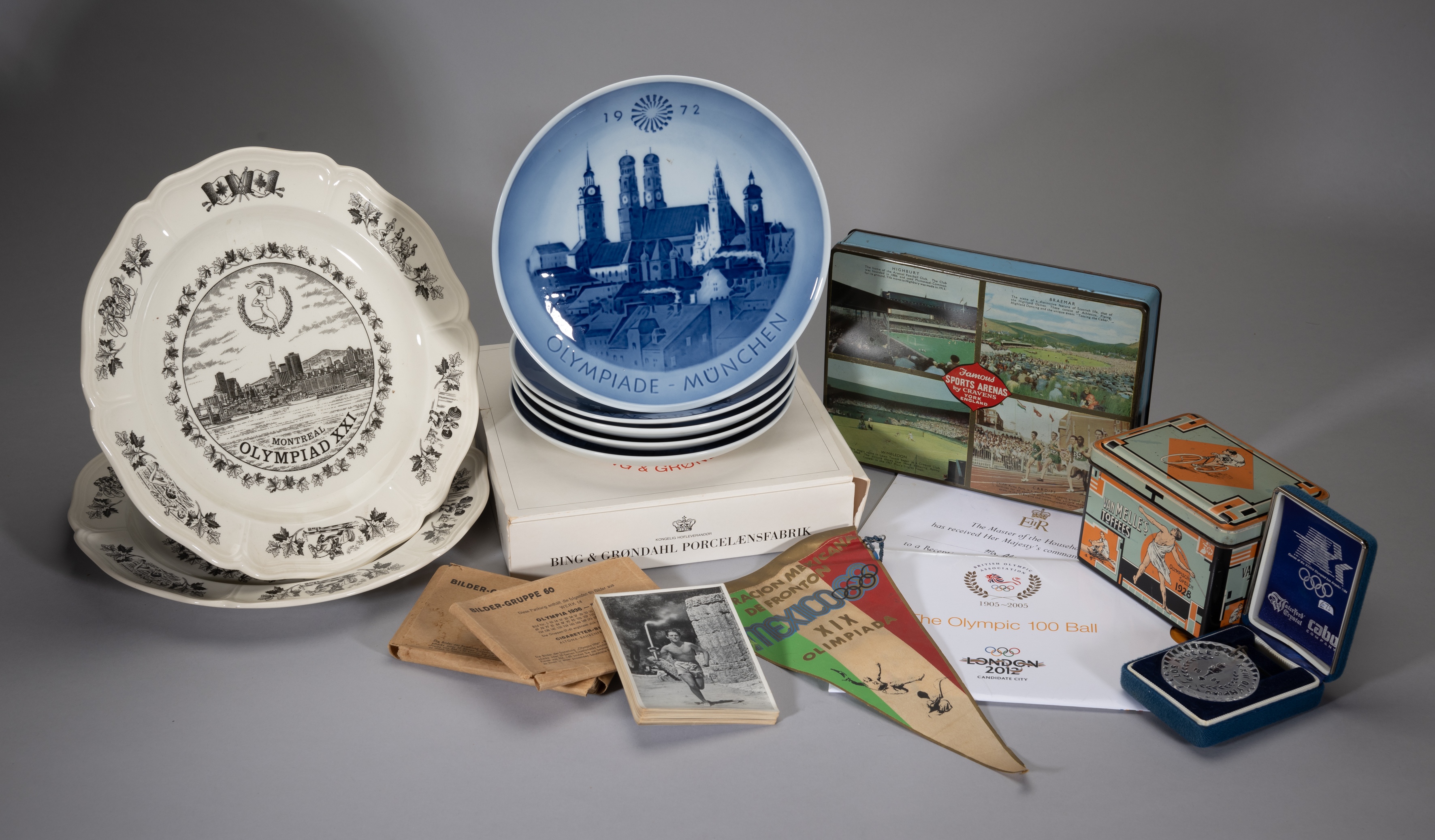 Collection of Commonwealth and Olympic games memorabilia, includes five Royal Copenhagen commemorative Olympic plates including '72 '76 '80; Wedgewood Montreal '76 commemorative plates; 1928 Melle's toffee tin; Mexico 1968 Olympic souvenir Pennant; two sets of 1936 Olympic German Cigarette cards in original packaging; Waterford Crystal glass; commemorative pennant and ribbon 1984 LA Olympics, (qty)