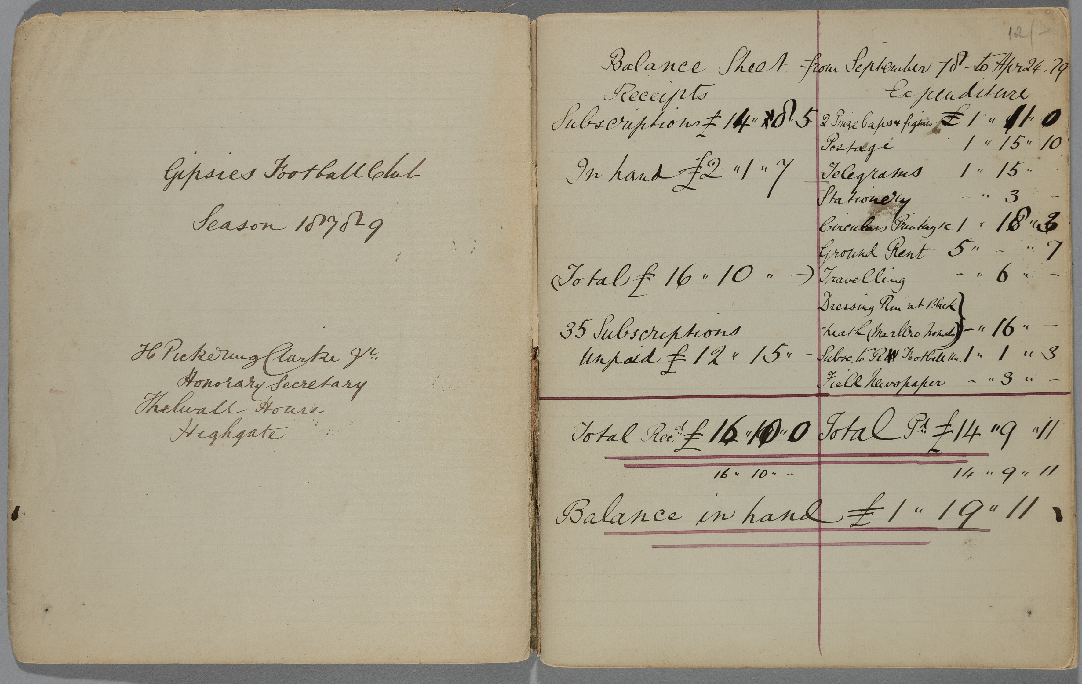 Gipsies [Rugby] Football Club Hon. Secretary's hand-written book for season 1878-79, compiled in ink by H Pickering Clarke, Thelwall House, Highgate,