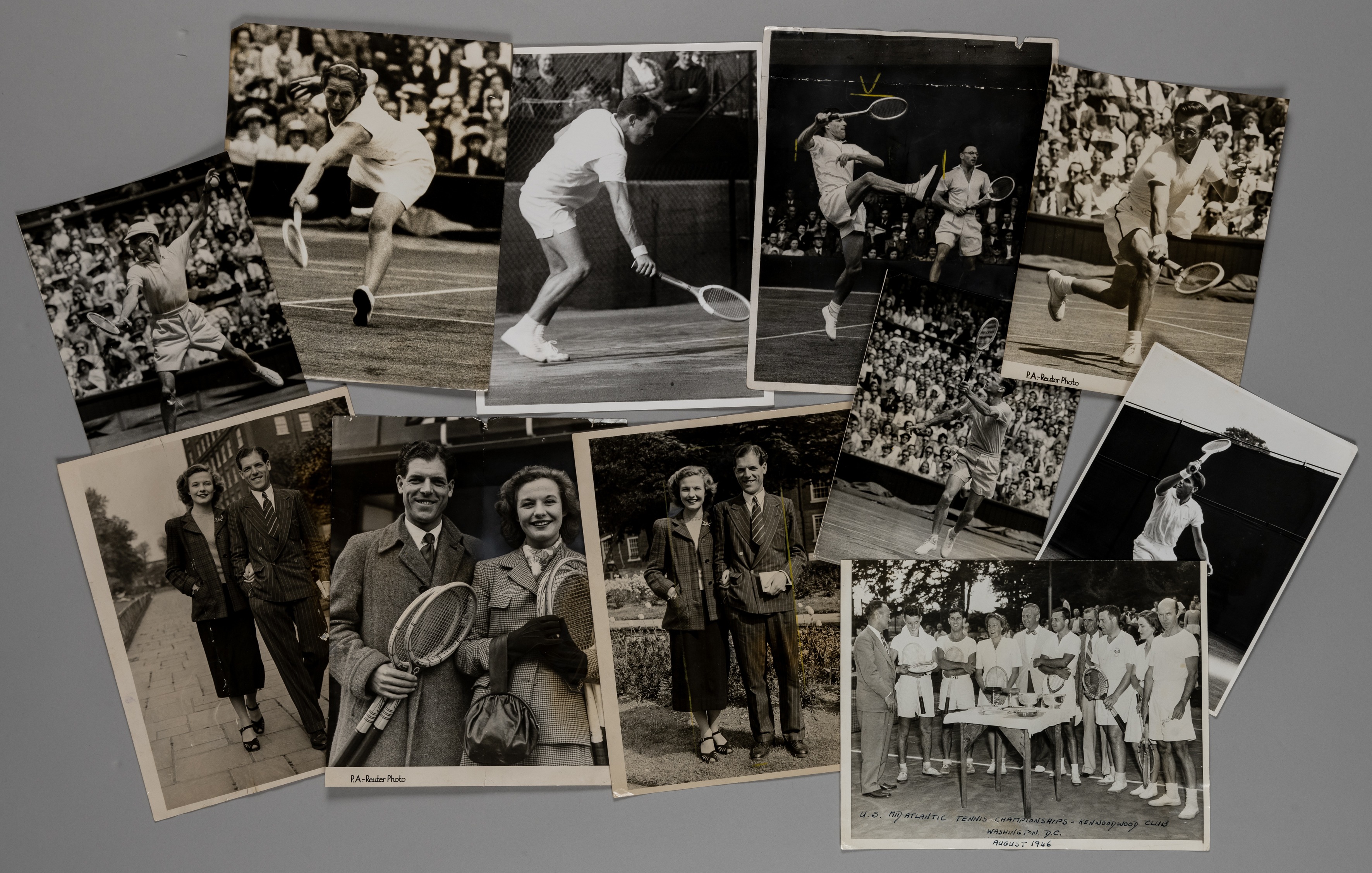Tennis: collection of 11 original 1930’s and 1940’s tennis photographs, sizes all between 8 by 6in. (4) and 10 by 8in. (7), players include Frank Parker, Tony Mottram, Joy Gannon, U.S 1946 tennis team, Jaroslv Drobny & Vladimir Cernic, 1938 Miss M. Lumb action image from the Wightman Cup 1938 competition at Wimbledon, (11)