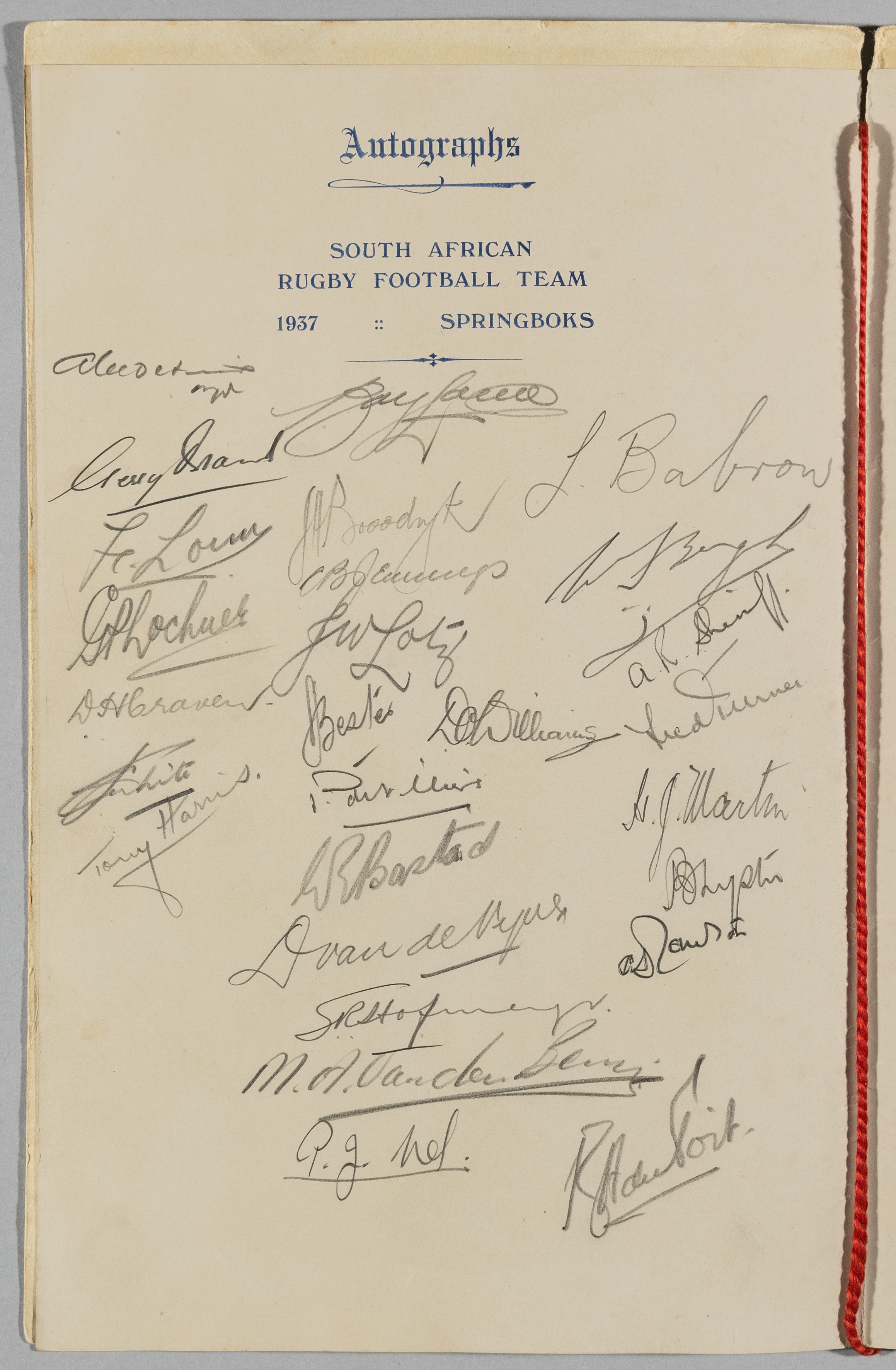 Signed South Africa tour to Australia dinner menu from the voyage on the T.S.S. Awatea on 3rd October 1937, signed by some of the ships crew in ink on inner page and by 27 members South African touring squad in pencil on autograph page including Phil Nel (captain), Danie Craven, Louis Babrow, and many others Condition fair to good with wear to outer cover, splits to spine and tears to cover edge, signs of stains