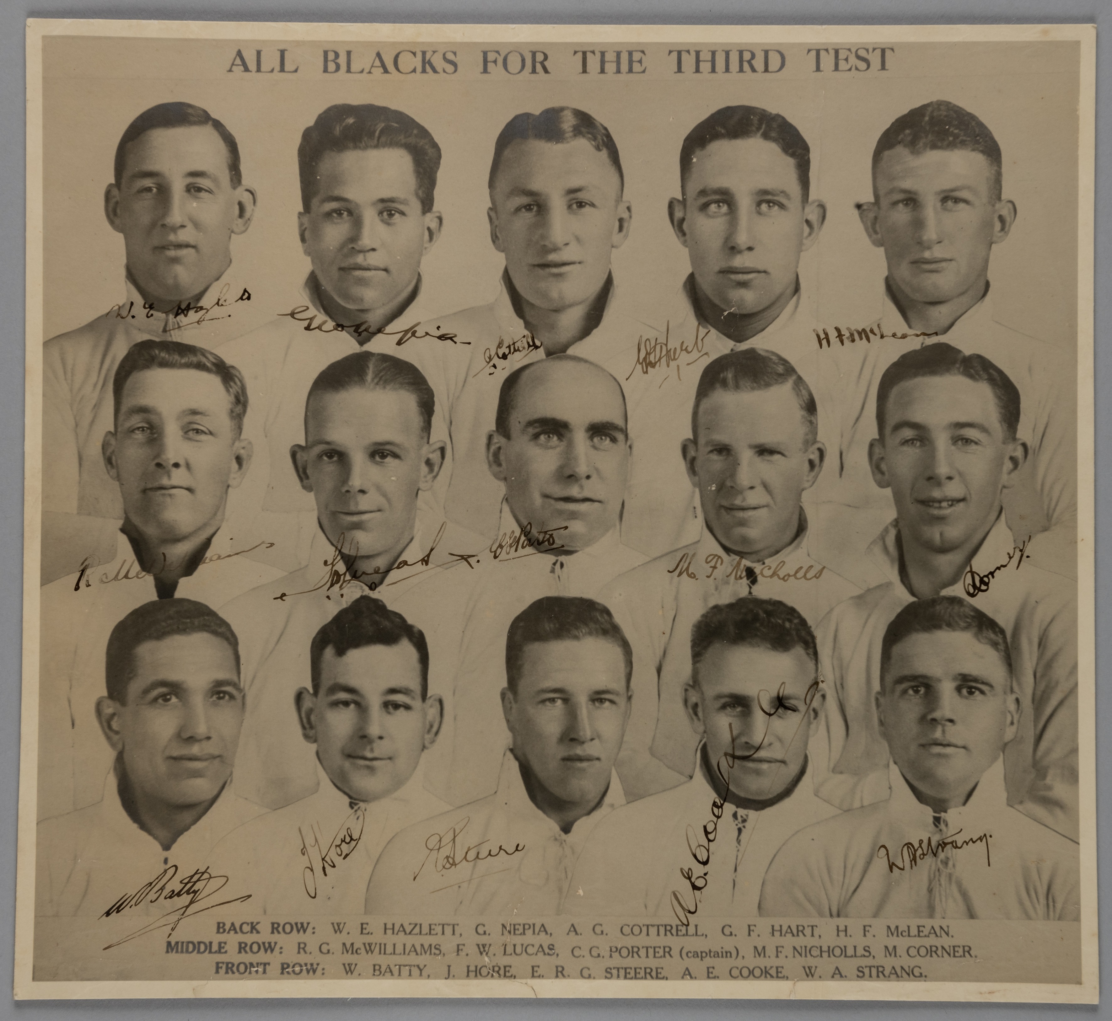 New Zealand All Blacks 1930 3rd test v British Lions superb autographed original black and white/sepia composite photograph, size 11 ¼” x 10 ¼” unknown publisher, laid down border to border to the photographers original stiffened backboard mount, depicting the 1930 New Zealand ‘All Blacks’ team that defeated the British Lions by 15 points to 10 in the 3rd test match of the New Zealand leg of the 1930 British Lions tour. Each player depicted in head and shoulders pose within this composite image, with printed header and player names. beautifully autographed in black ink by the full New Zealand ‘All Blacks’ 1930 team, 15 original ink signatures including: Cliff Porter (captain), George Nepia, Bill Hazlett, Beau Cottrell, George Hart, Hugh Mclean, Reuben McWilliams, Fred Lucas, Mark Nicholls, Merv Corner, Walter Batty, Jack Hore, Dick Steere, Bert Cooke and Archie Strang. very good condition. The 1930 British Lions tour to New Zealand and Australia was the twelfth tour by a British Isles team and the fifth to New Zealand and Australia. This tour is recognised as the first to represent a bona fide British team and the first to be widely dubbed the 'Lions', after the nickname was used by journalists during the 1924 tour of South Africa. Led by England's Doug Prentice and managed by James Baxter the tour took in 28 matches, seven in Australia and 21 in New Zealand. Of the 28 games, 24 were against club or invitational teams, four were test matches against New Zealand and one was a test match against Australia. The test match results saw the Lions lose to Australia, and win only one of the four New Zealand tests