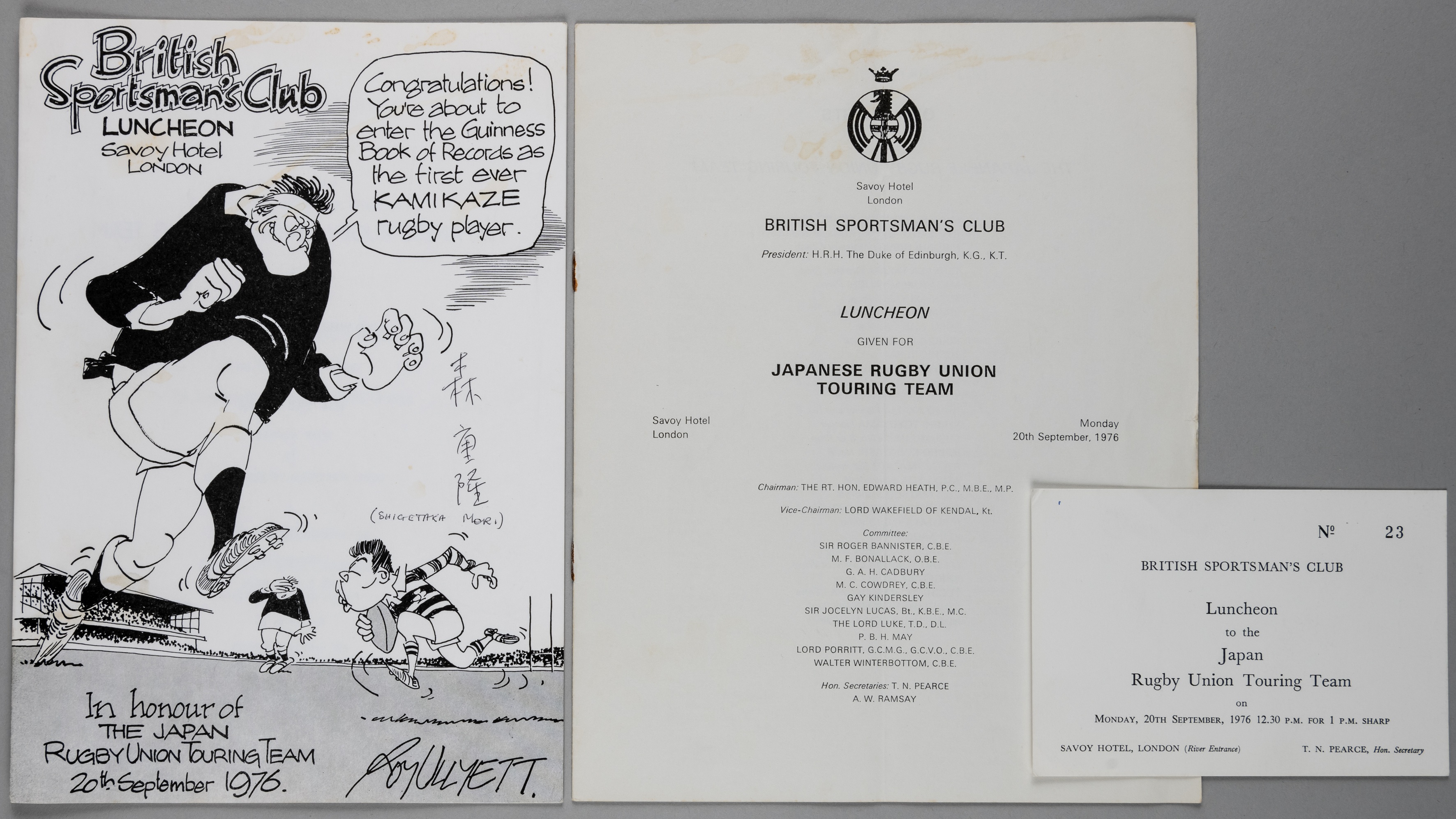 Japan rugby union tourists to the UK 1976 original British Sportsman’s Club menu, seating plan & invitation for a celebration dinner, to welcome the 1976 Japanese rugby union touring team to the UK, held at the Savoy Hotel, London, 20th September, 1976, decorative Roy Ullyett cartoon to the front cover with further printed details to the inner pages and back cover, the menu signed to the cover by the Japanese centre Shigetaka Mori. The four page seating plan has a vertical former fold mark and the invitation has writing to the back cover which looks like possible speech notes. All three items in good condition The 1976 Japan rugby union tour of Europe was a series of ten matches played by the Japan national rugby union team in the United Kingdom and Italy in September and October 1976. Japan won three and lost seven of their ten matches. They lost all three of the matches against international representative teams; a Scottish XV, England under-23 and Italy.