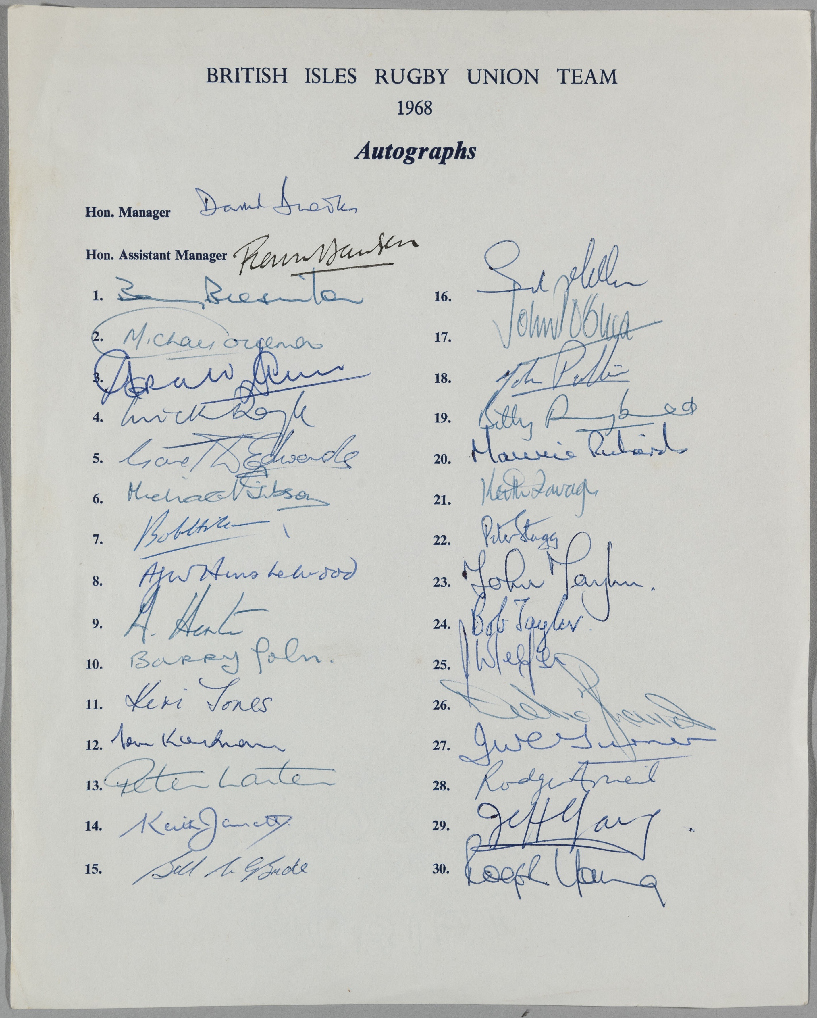 Signed autograph page of the British Isles rugby union team tour to South Africa in 1968, signed in ink by squad members and and management, including Tom Kiernan (captain), Mike Gibson, Mick Doyle, Willie John McBride, Syd Millar, Gareth Edwards, Gerald Davies, Gordon Connell, Bob Hiller, Jock Turner, David Brooks (manager), Ronnie Dawson (coach) and many others Condition good with minor marks