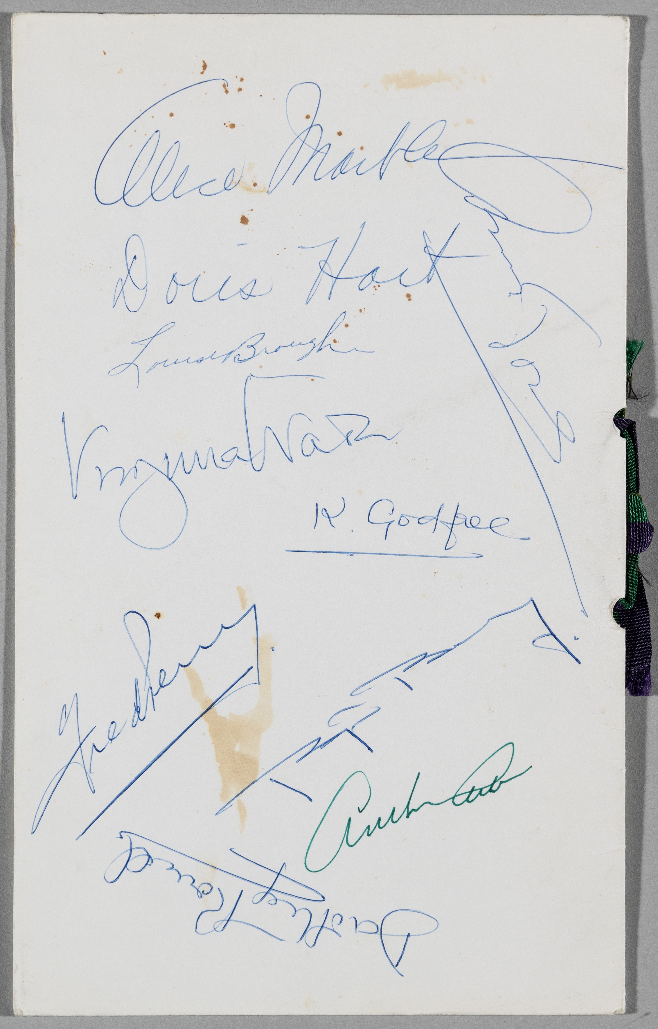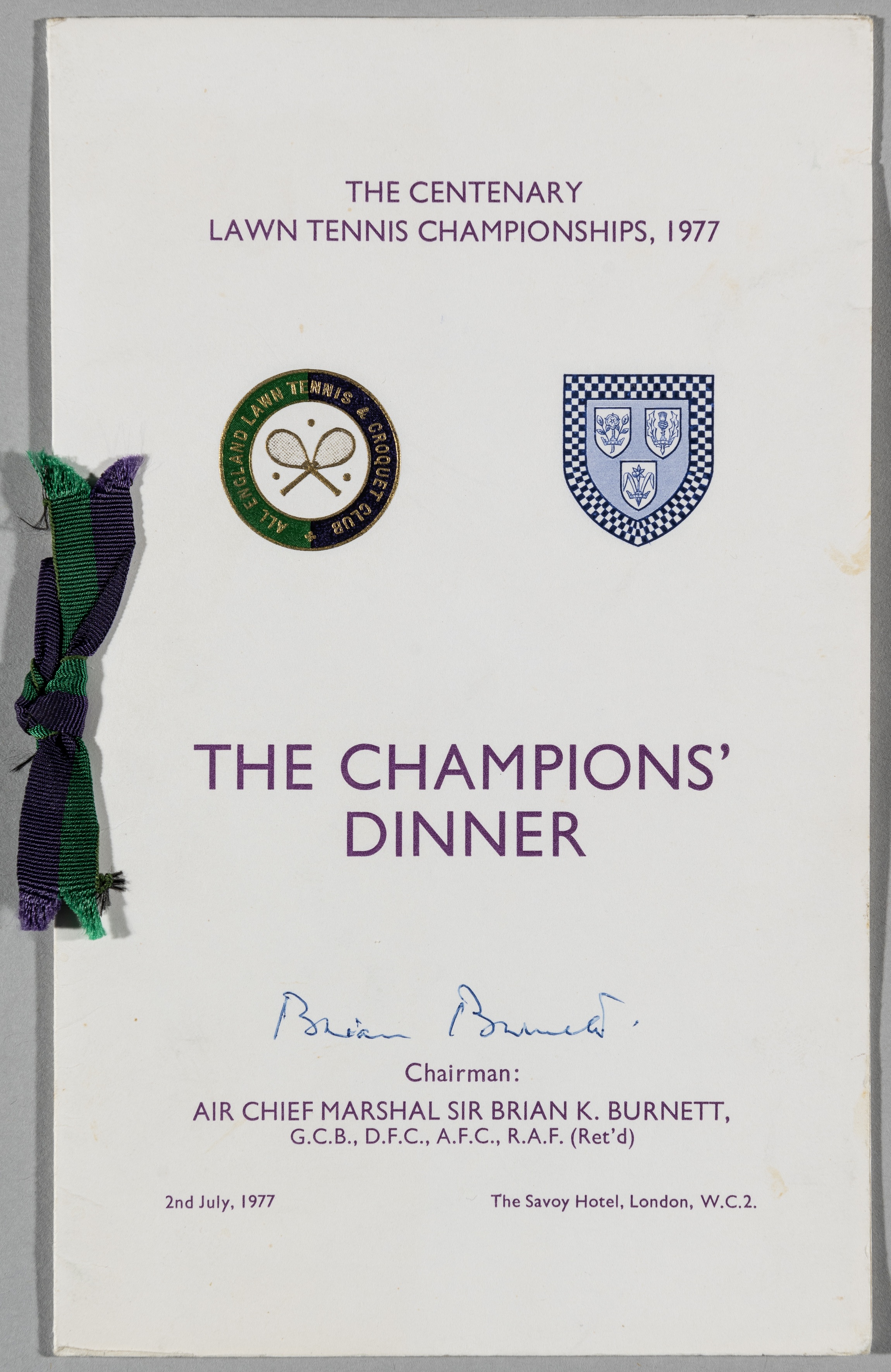 Signed The Centenary Lawn Tennis Championships 'The Champions Dinner' menu, held at The Savoy Hotel on 2nd July 1977, multi-signed on front and reverse covers by approx. 11 tennis stars, including Fred Perry, Doris Hart, Virginia Wade, Dorothy Round, Kitty Godfree, Ann Jones, Louise Brough, Bjorn Borg and Arthur Ashe, etc. Bears some wear and staining to cover and interior pages Provenance: formerly the property of Laurie Pignon and Lot 1645 Ewbanks Auctioneers 6th September 2016