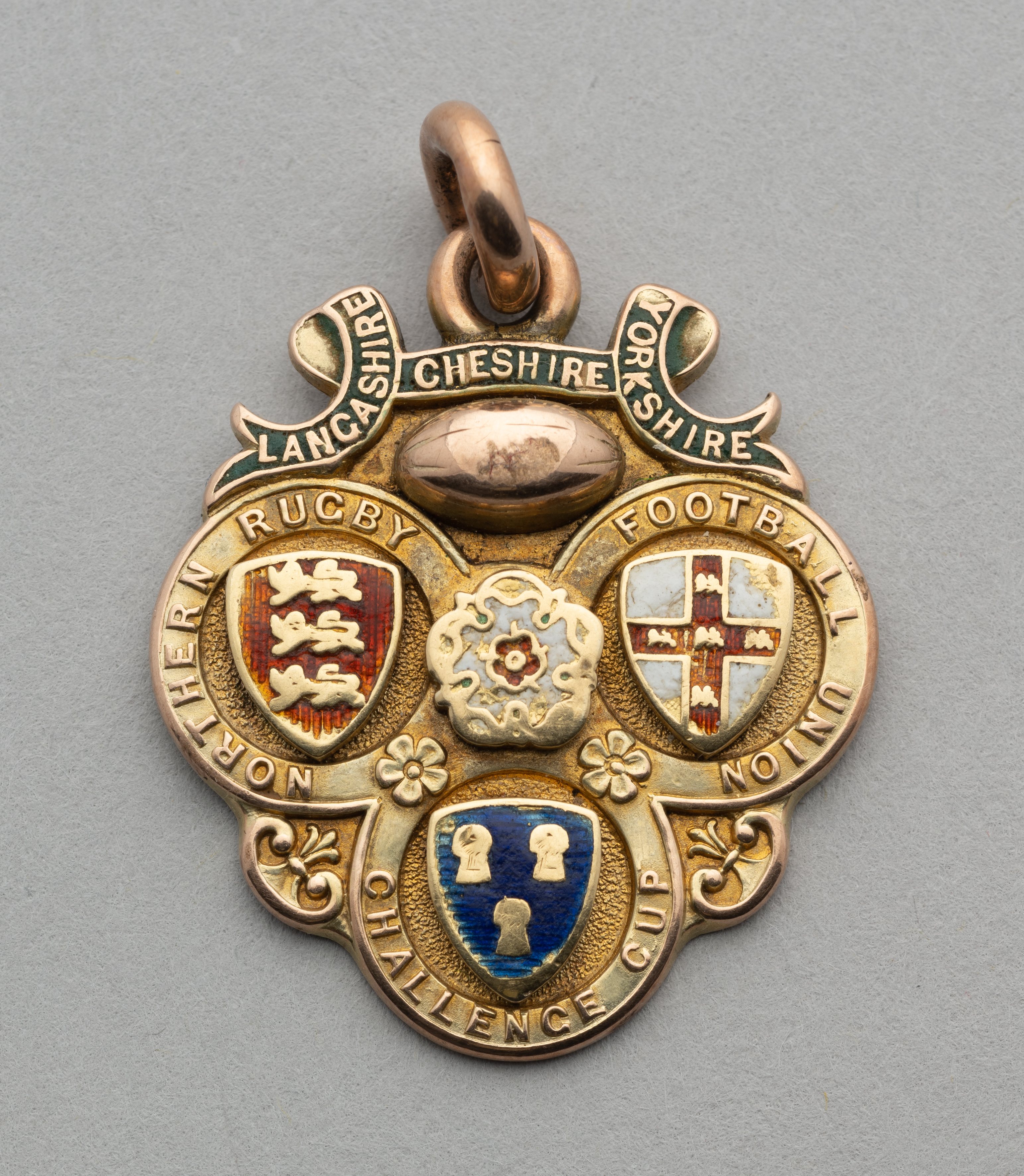 A 9ct gold and enamel Rugby League Challenge Cup Medal, 1898-99, the obverse inscribed Lancashire, Cheshire, Yorkshire, Northern Rugby Football Unio