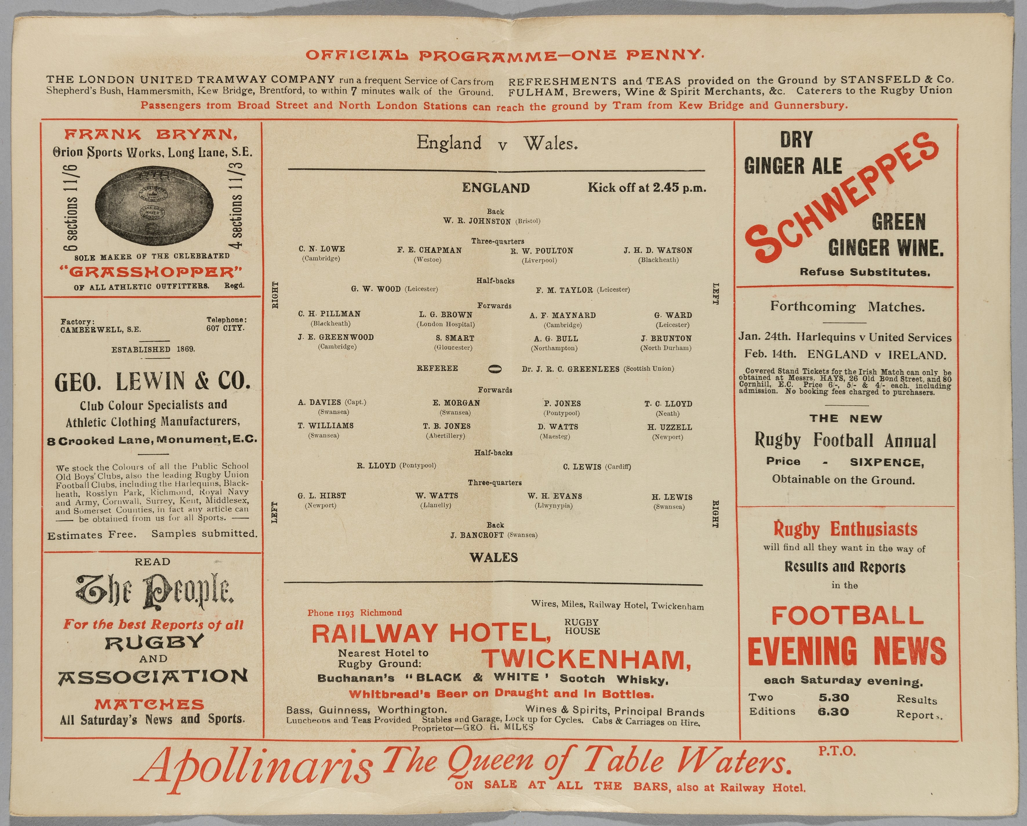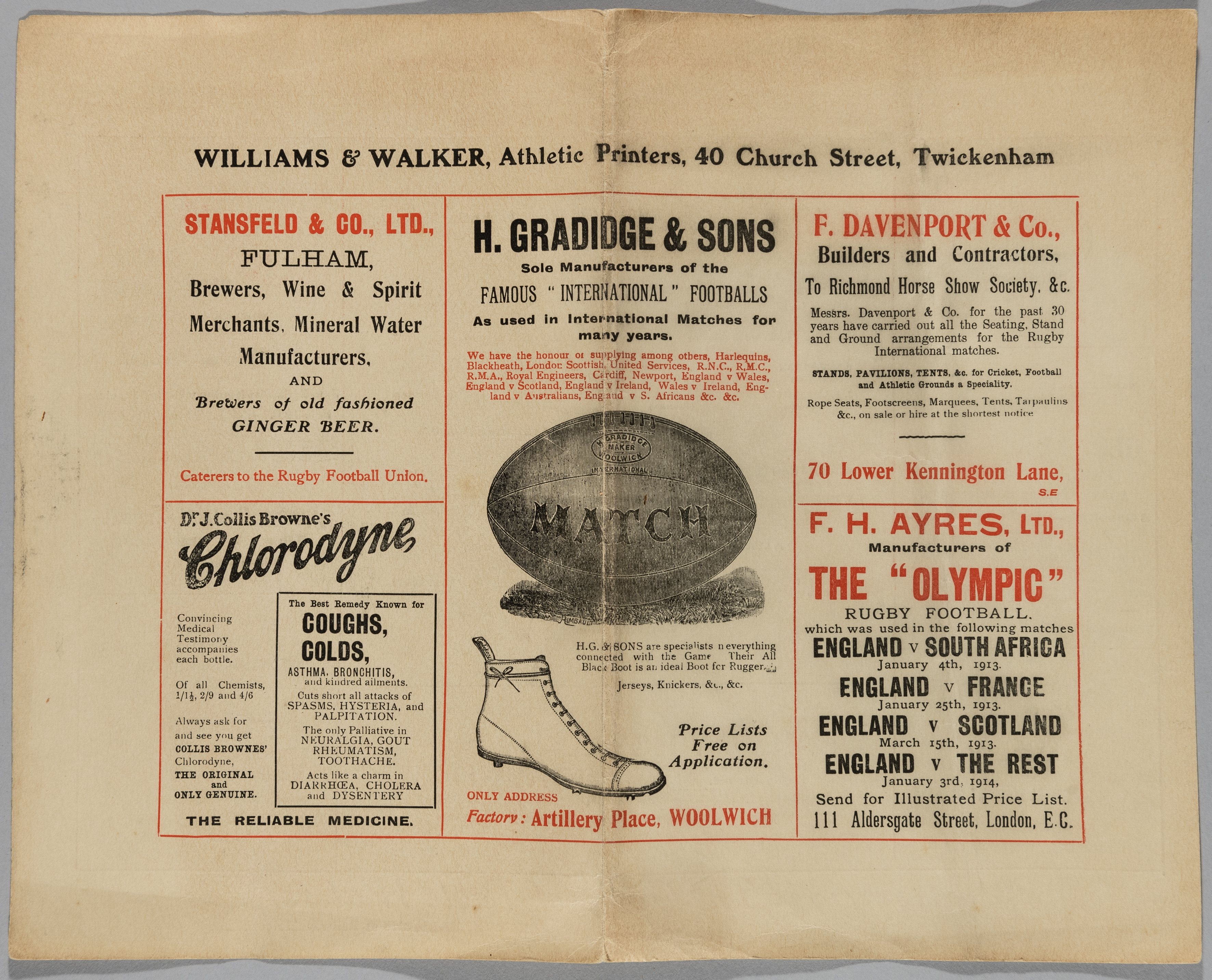 England v Wales international Rugby Union match programme played at Twickenham 17th January 1914, folded card, good condition England won the Grand