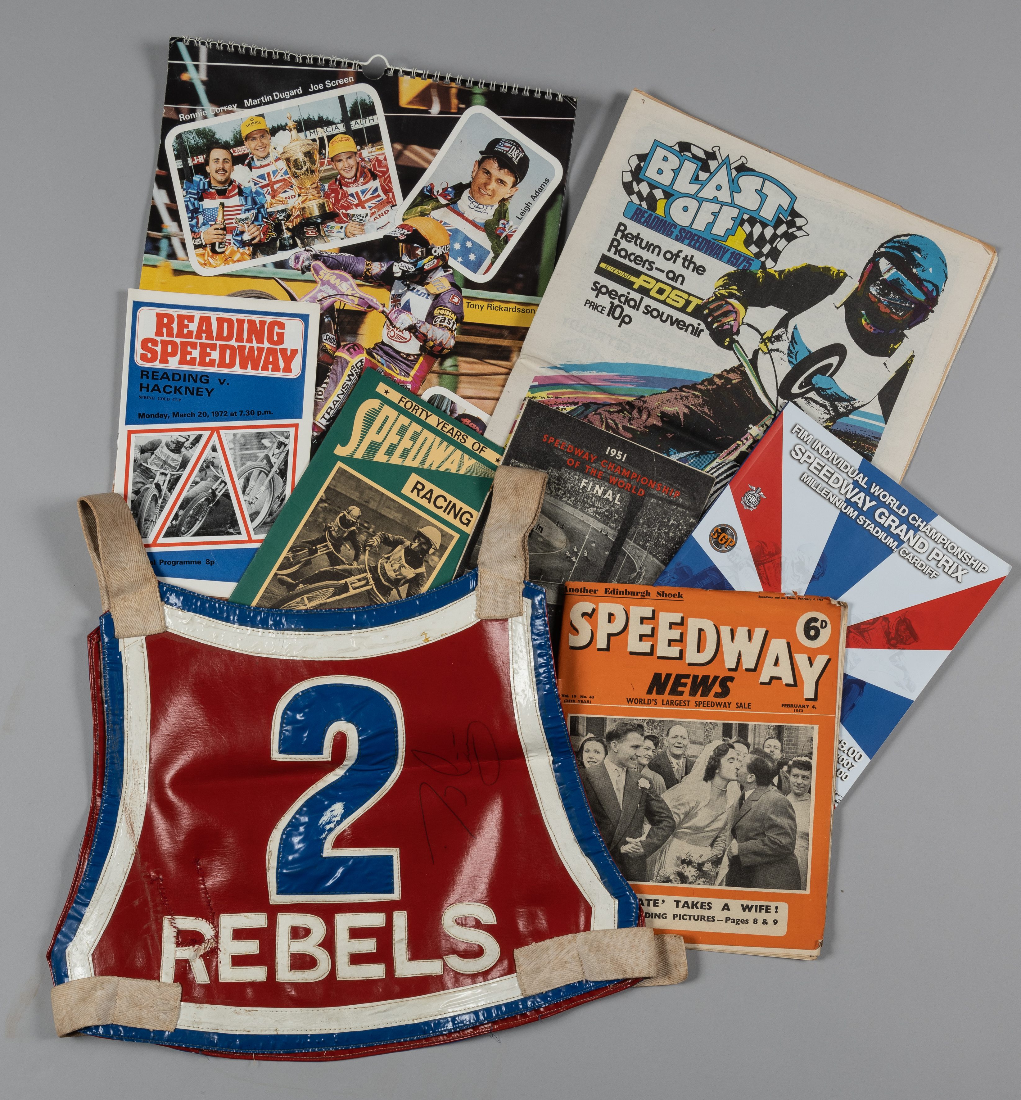 Collection of Speedway programmes and ephemera, Reading Speedway the best represented, typically 1960s onwards but including some Wembley programmes from the 1950s, including newspapers, magazines, souvenir publications etc., also a riders bib for Oxford Rebels signed by Dag Lovas, (qty)