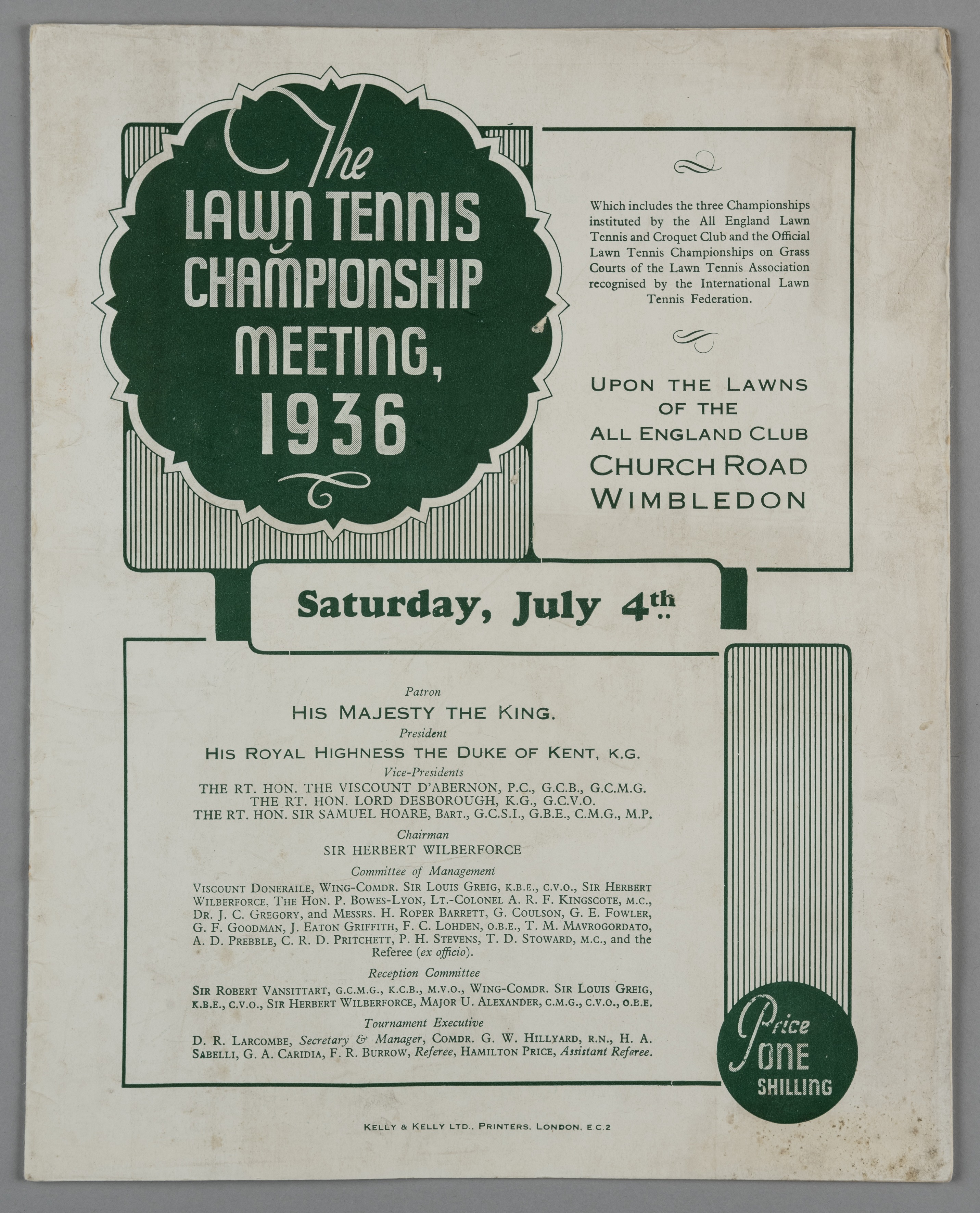 Wimbledon 4th July 1936 - Fred Perry wins his third singles title – Rare Final day Wimbledon programme, won for the third consecutive year by Fred Perry, with printed match details for the Men’s Singles Final between Fred Perry and Gottfried Von Cramm only, after which the names of the respective victors on the final day of the championship have been neatly completed by hand Very good condition, no creases or folds