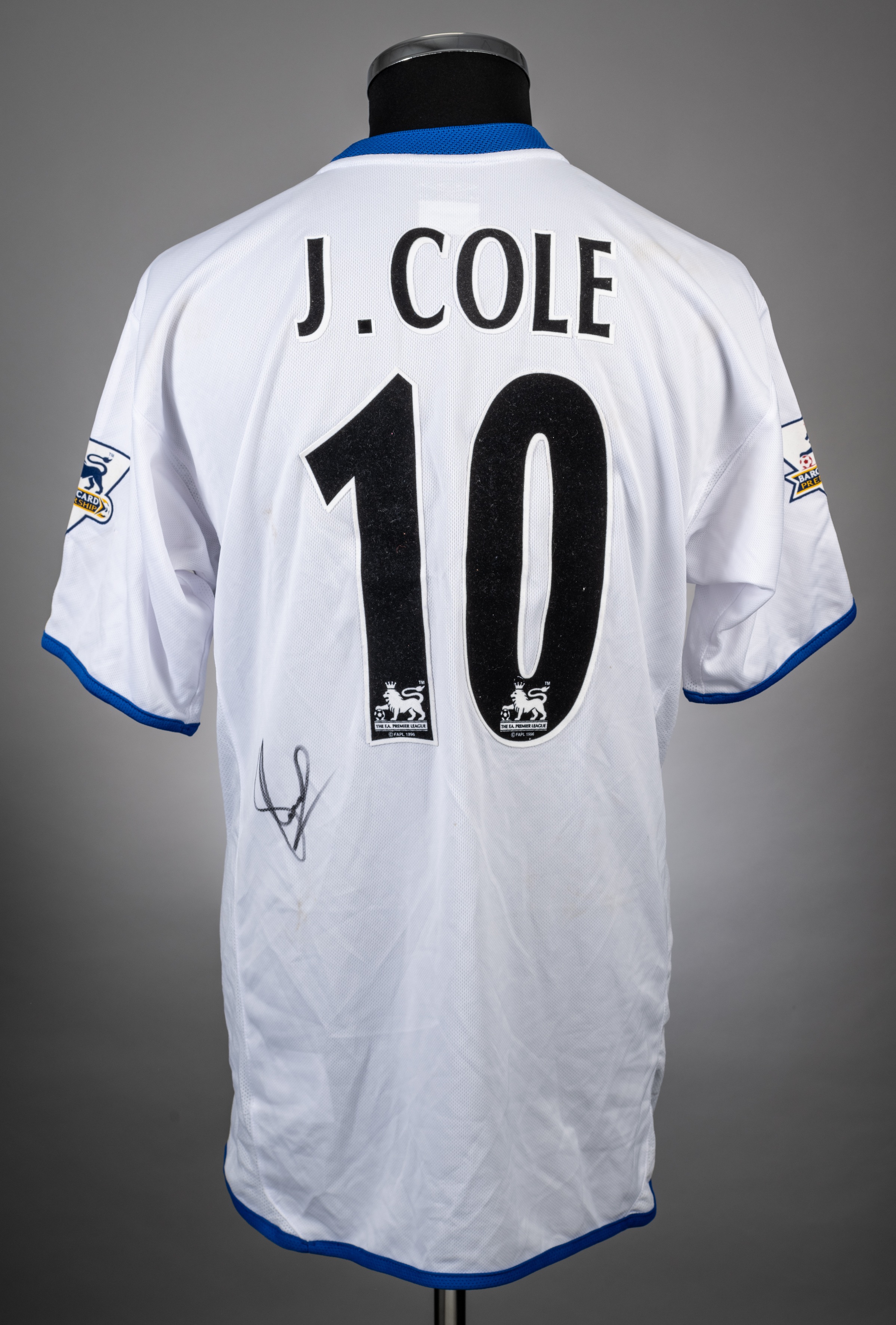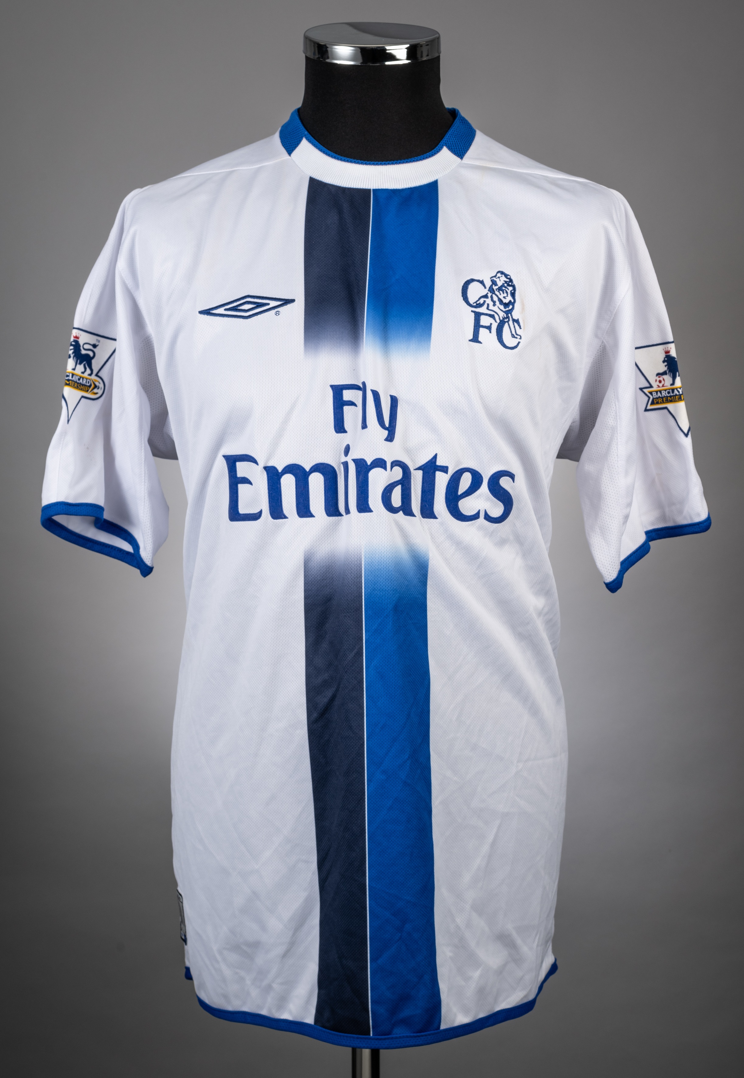 Joe Cole white and blue No.10 Chelsea short-sleeved jersey, 2003-04, Umbro, L, with crew-neck collar and embroidered badge inscribed CFC, the reverse lettered J.COLE, the sleeves with Barclaycard Premiership flashes