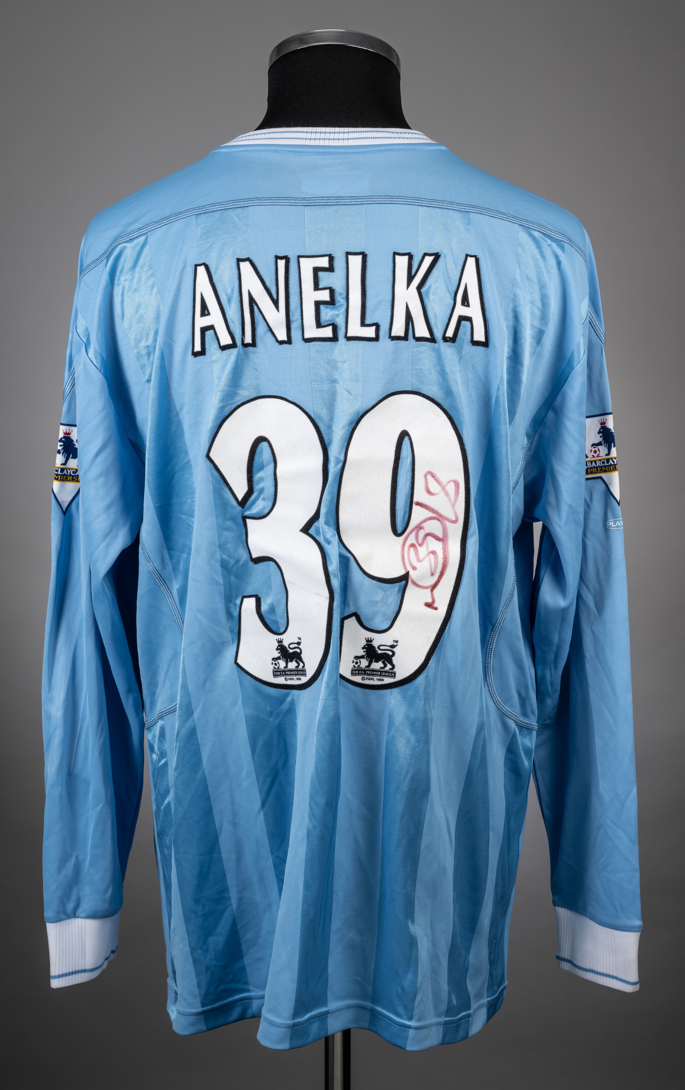Nicolas Anelka sky blue No.39 Manchester City long-sleeved jersey, 2003-04, Reebok, L, with v-neck collar and embroidered badge M.C.F.C., the reverse lettered ANELKA, the reverse also autographed by Nicolas Anelka