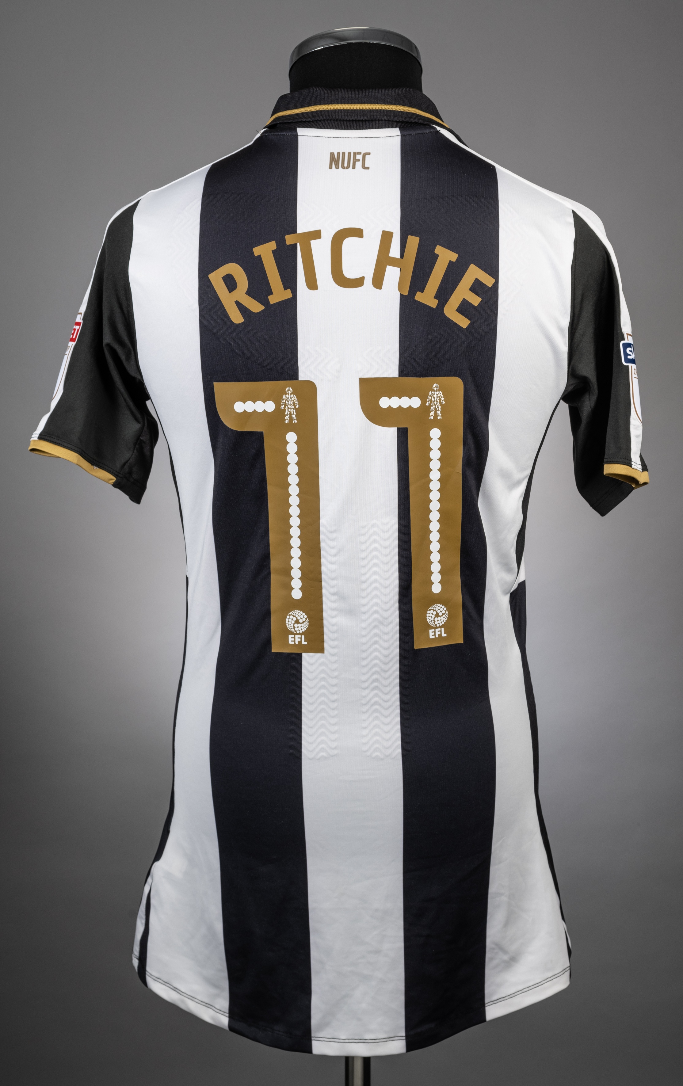 Matt Ritchie black and white No.11 Newcastle United short-sleeved jersey, 2016-17, Puma, L, with v-neck collar and printed badge, the reverse letter