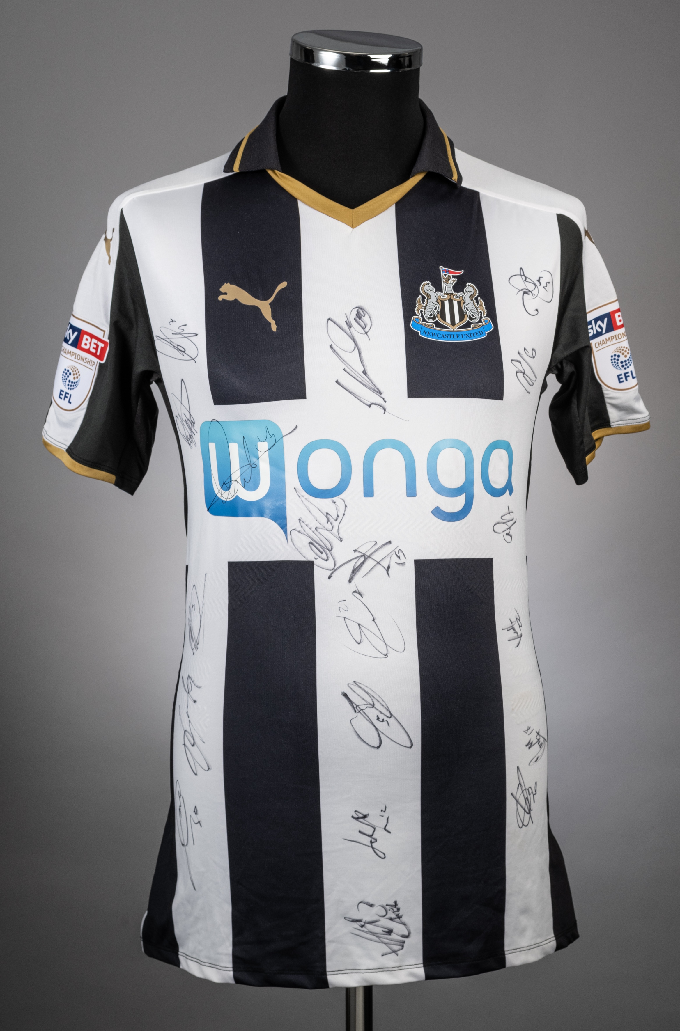 Matt Ritchie black and white No.11 Newcastle United short-sleeved jersey, 2016-17, Puma, L, with v-neck collar and printed badge, the reverse lettered RITCHIE, the front bearing nineteen player autographs, the sleeves with Sky Bet EFL Championship flashes