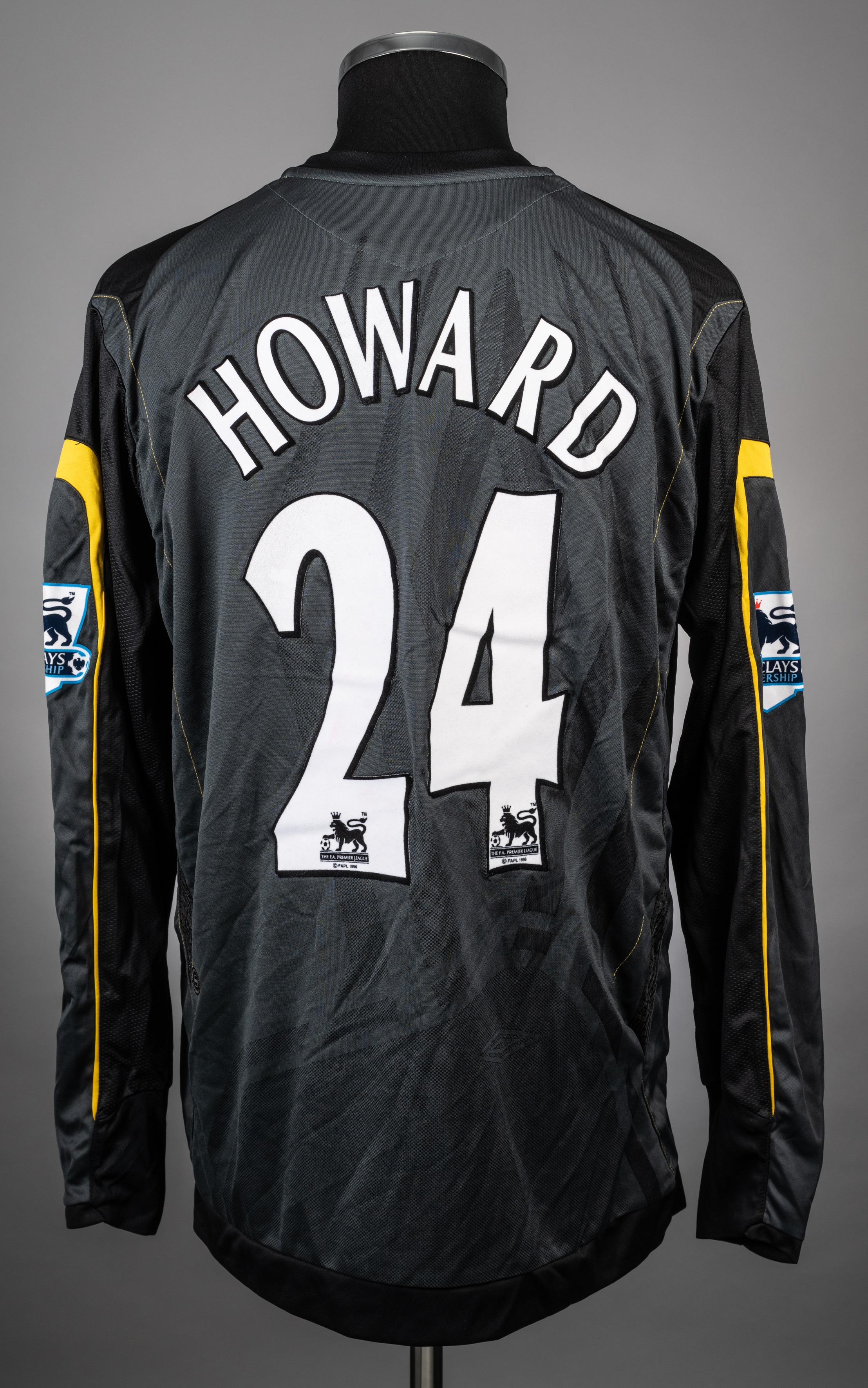 Tim Howard black and yellow No.24 Everton goalkeepers jersey, 2006-07, Umbro, XXL with crew-neck collar and embroidered badge inscribed 1878 NIL SATIS NISI OPTIMUM EVERTON, the reverse lettered HOWARD, the sleeves with Barclays Premiership flashes