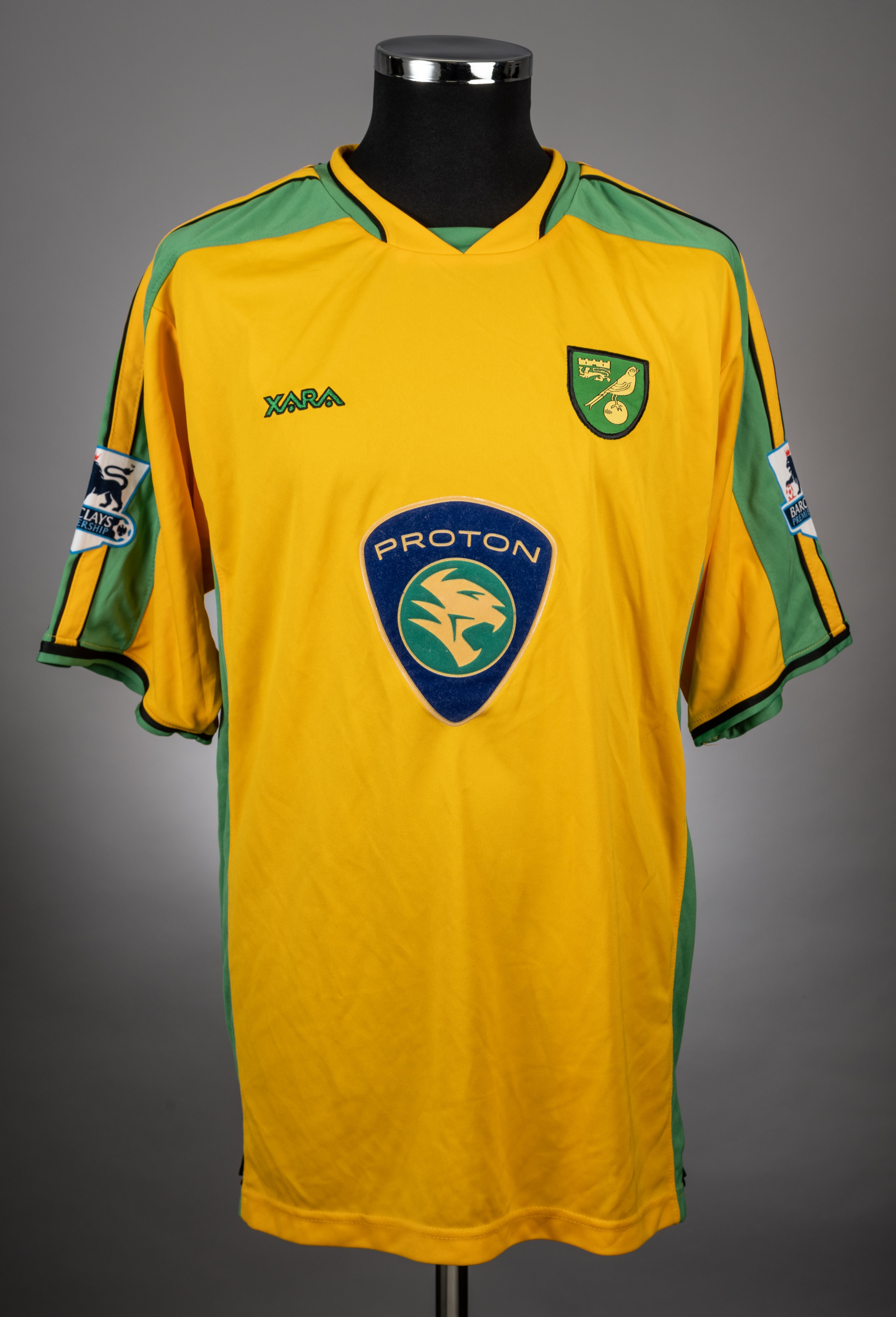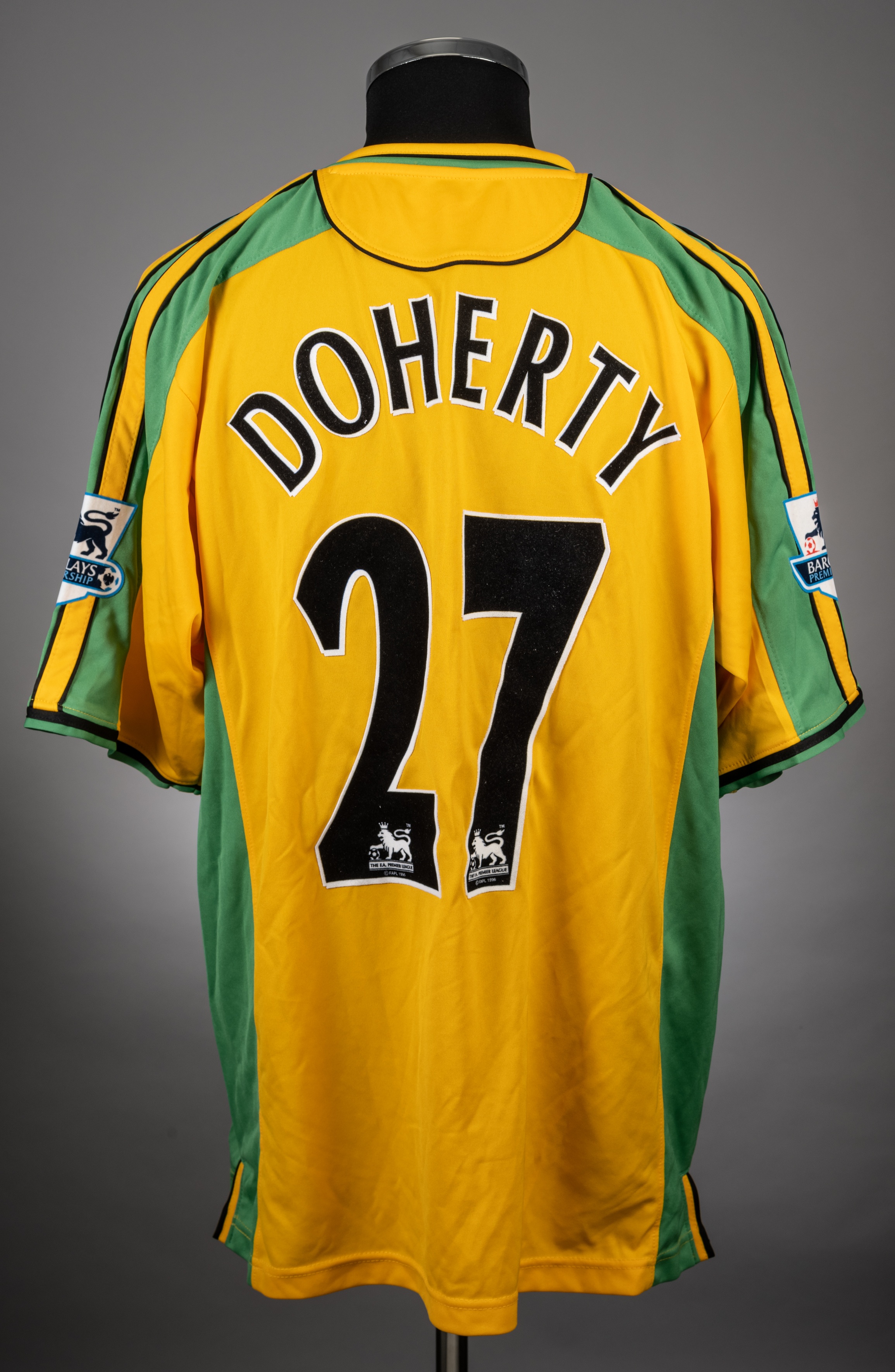 Gary Doherty yellow and green No.27 Norwich City short-sleeved jersey, 2003-05, Xara, L, with v-neck collar and embroidered cloth badge, the reverse lettered DOHERTY, the sleeves with Barclays Premiership flashes