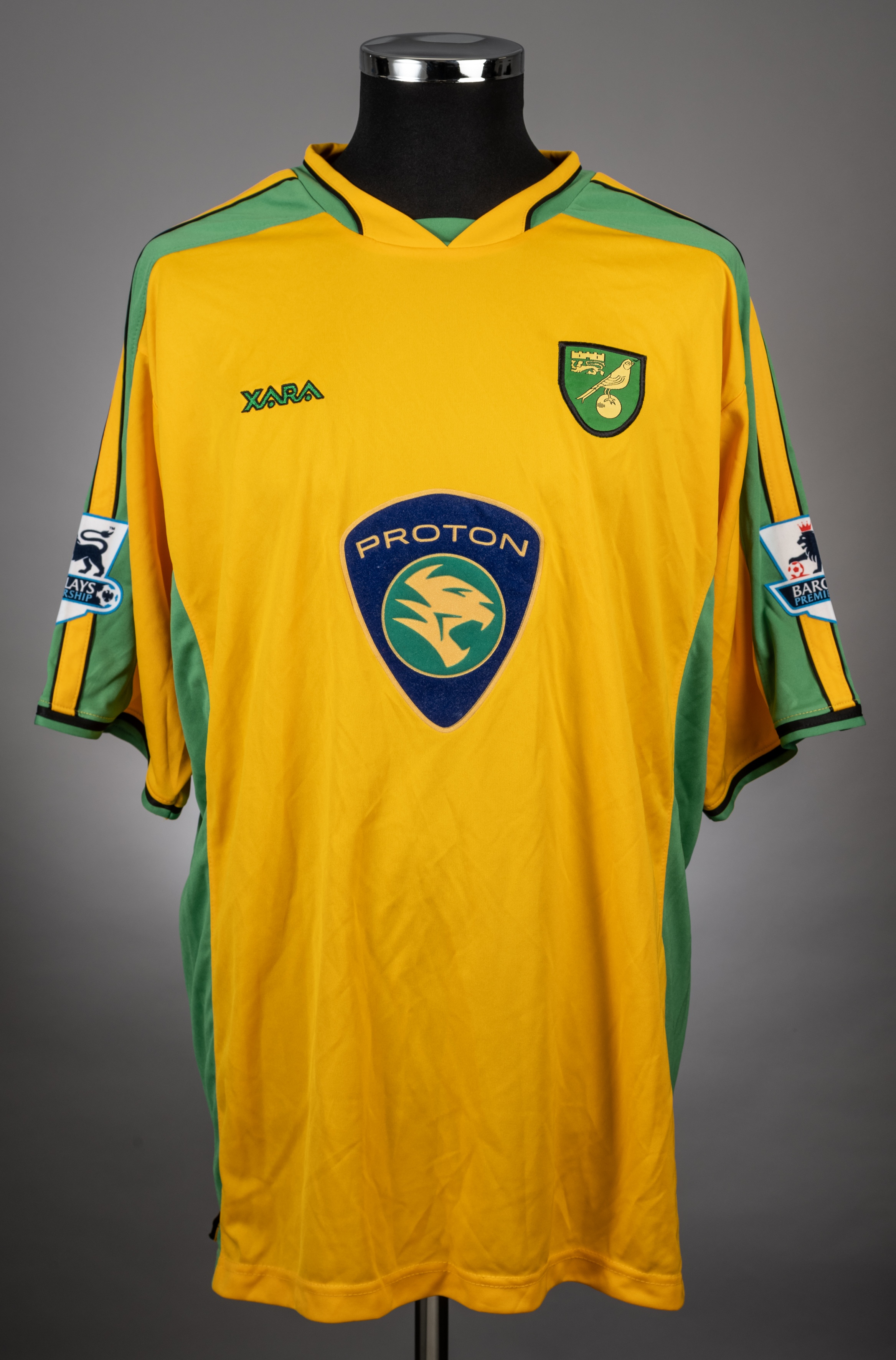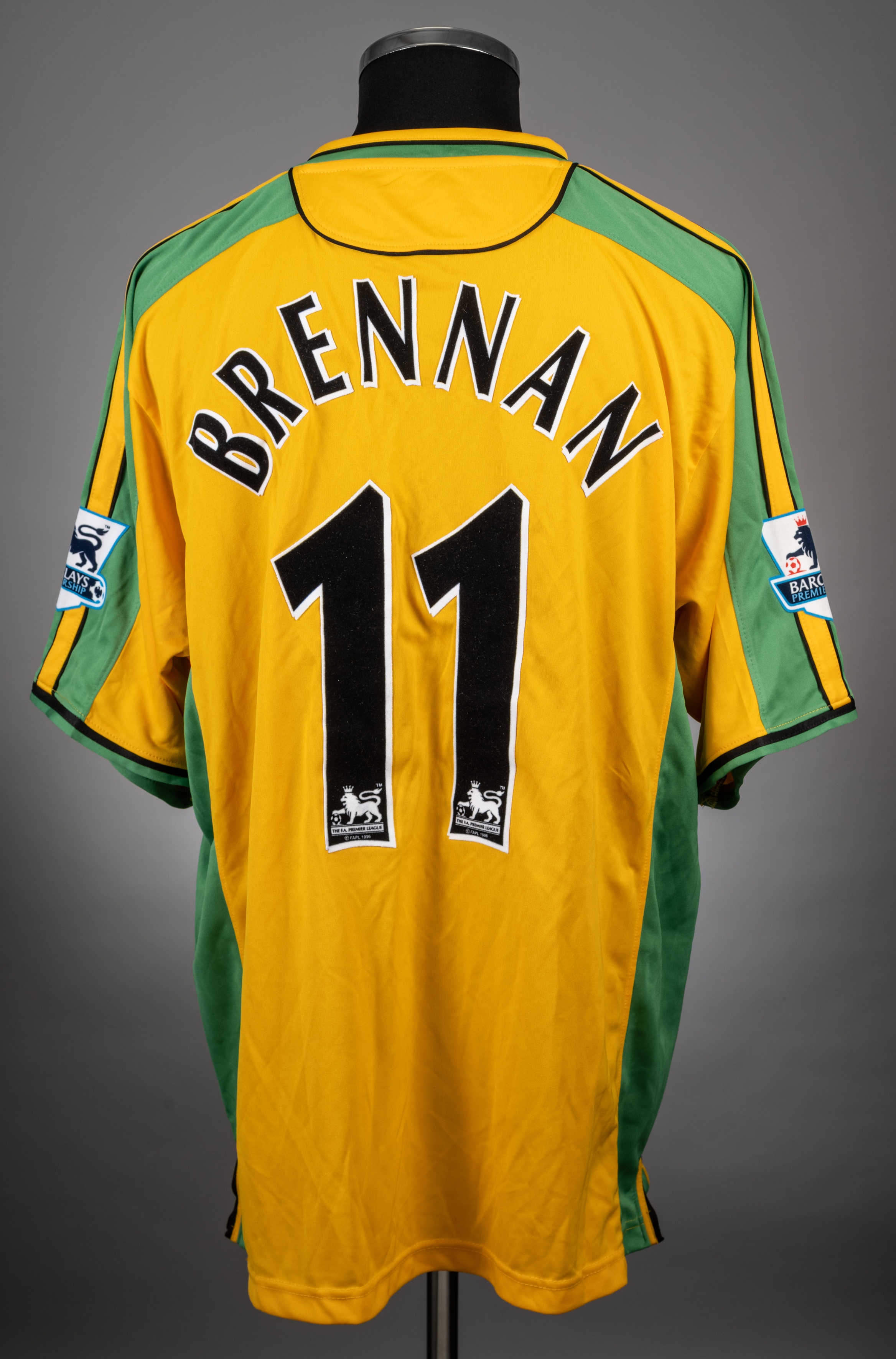 Jim Brennan yellow and green No.11 Norwich City short-sleeved jersey, 2003-05, Xara, XL, with v-neck collar and embroidered cloth badge, the reverse lettered BRENNAN, the sleeves with Barclays Premiership flashes