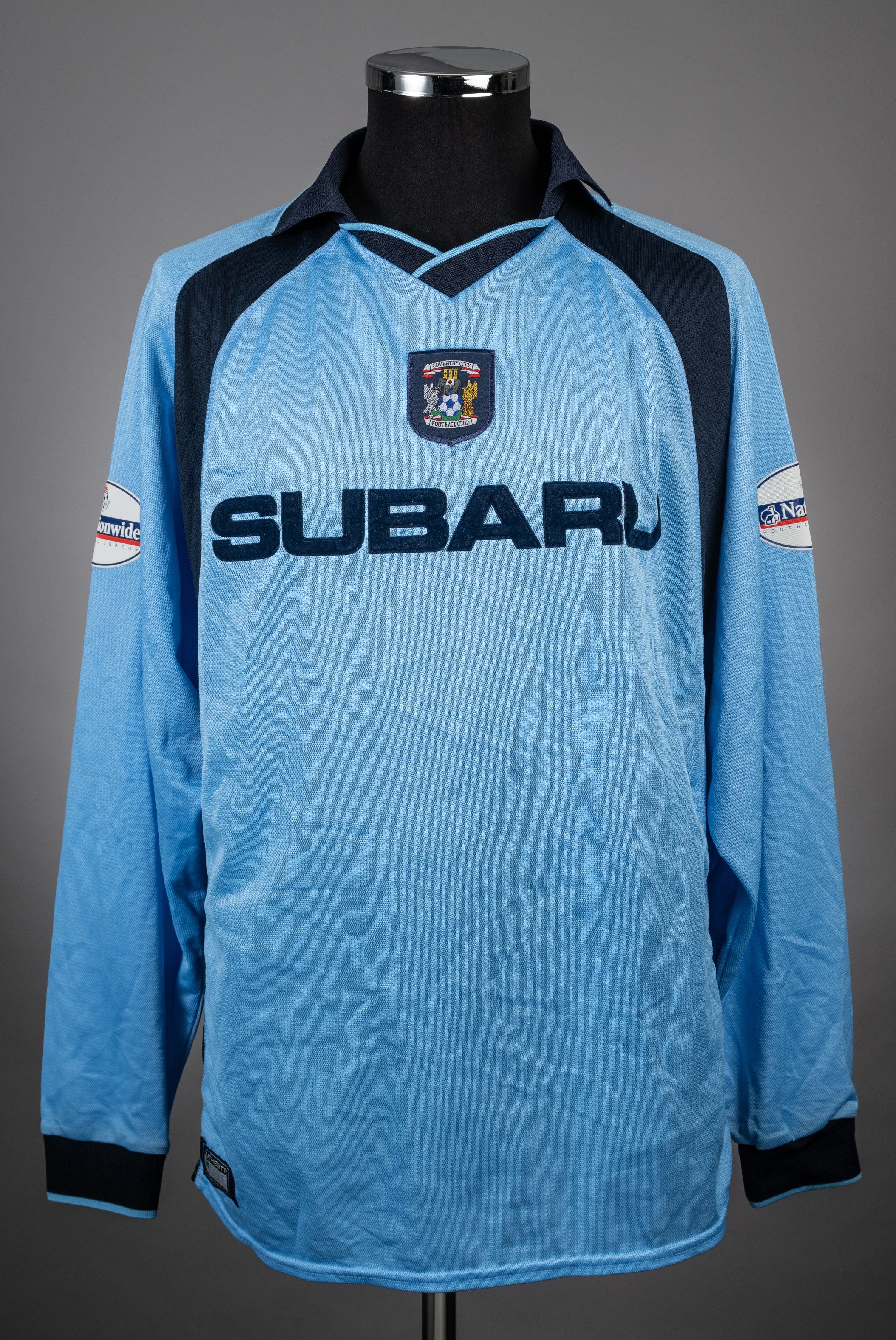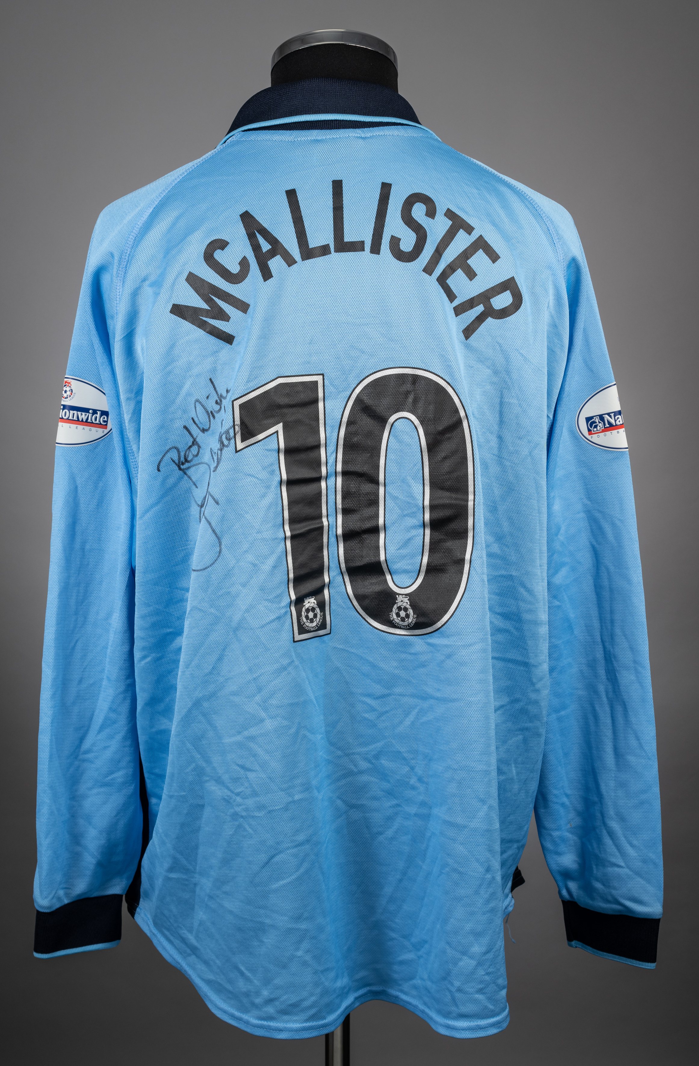 Gary McAllister sky blue No.10 Coventry City long-sleeved jersey, 2002-03, size 50-52, with v-neck collar and embroidered cloth badge inscribed COVENTRY CITY FOOTBALL CLUB, the reverse lettered McALLISTER, the reverse also autographed by Gary McAllister, the sleeves with Nationwide Football League flashes