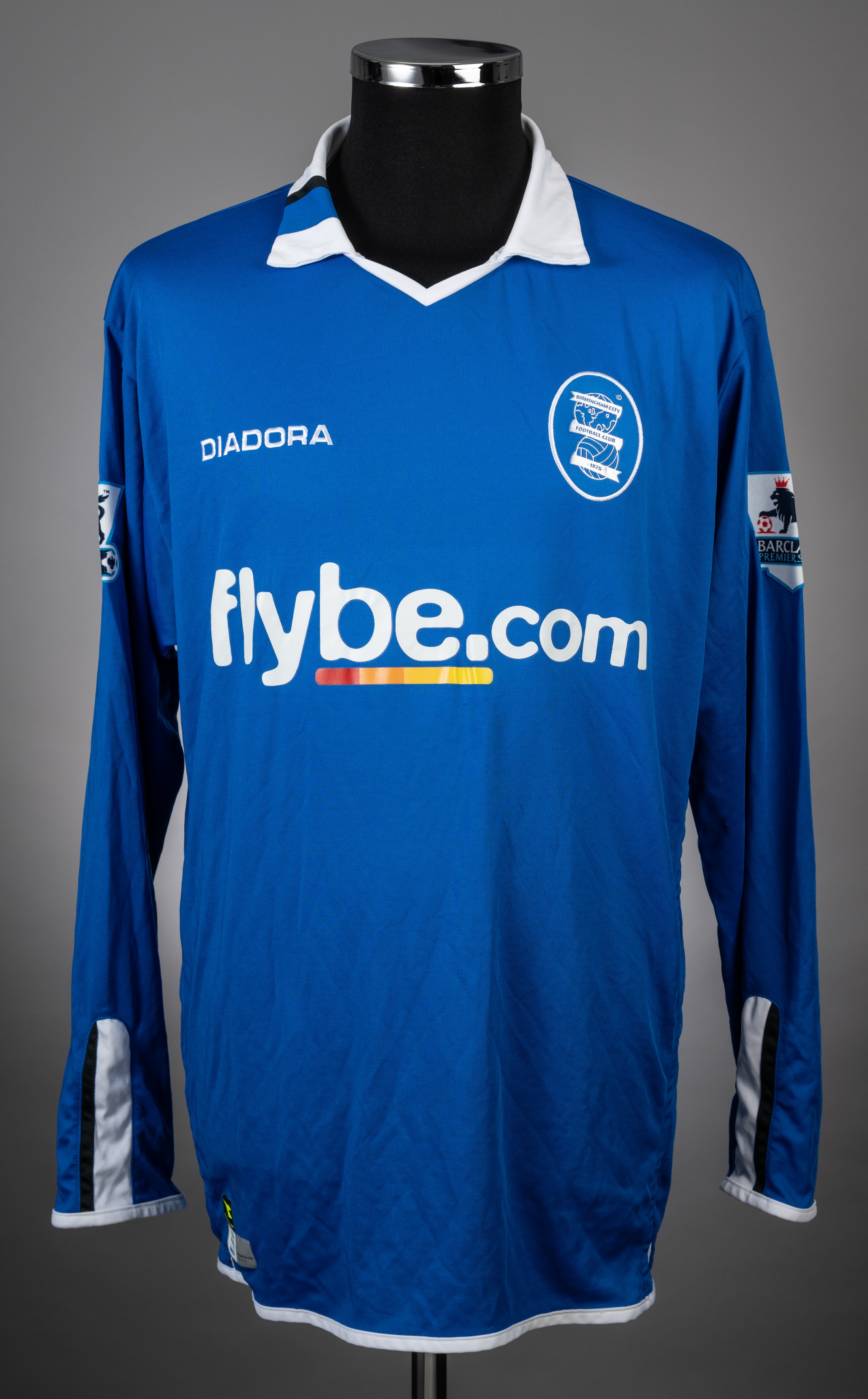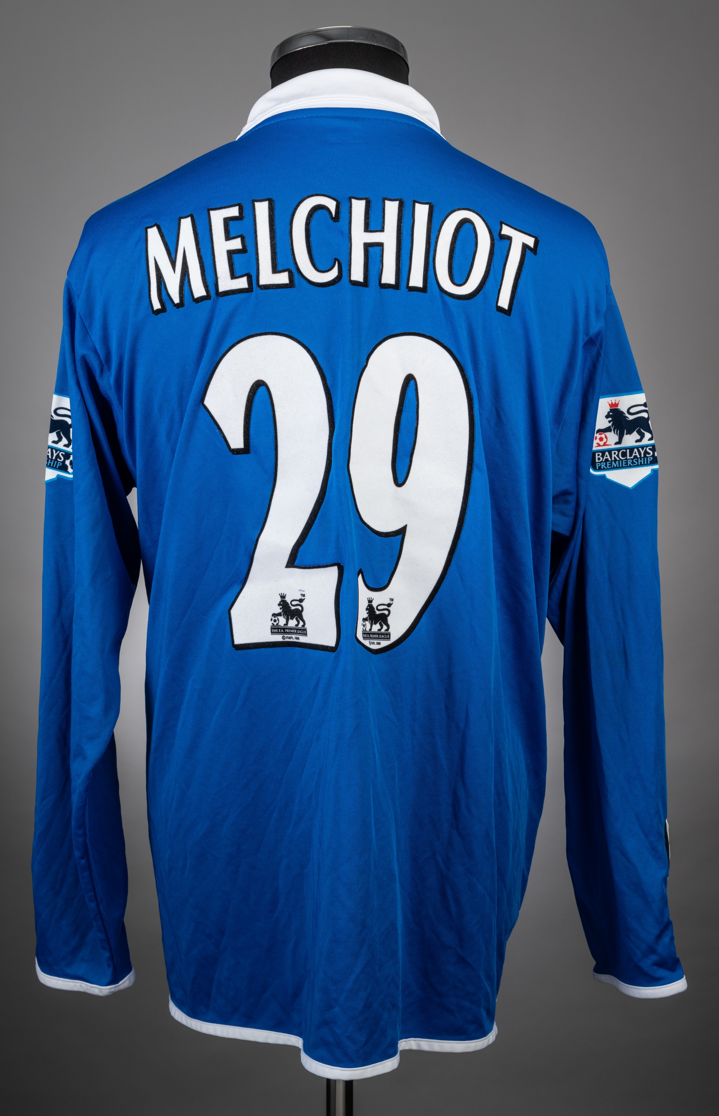 Mario Melchiot blue No.29 Birmingham City long-sleeved jersey, 2004-05, Diadora, size L, with v-neck collar and embroidered cloth badge inscribed BIRMINGHAM CITY FOOTBALL CLUB 1875, the reverse lettered MELCHIOT, the sleeves with Barclays Premiership flashes