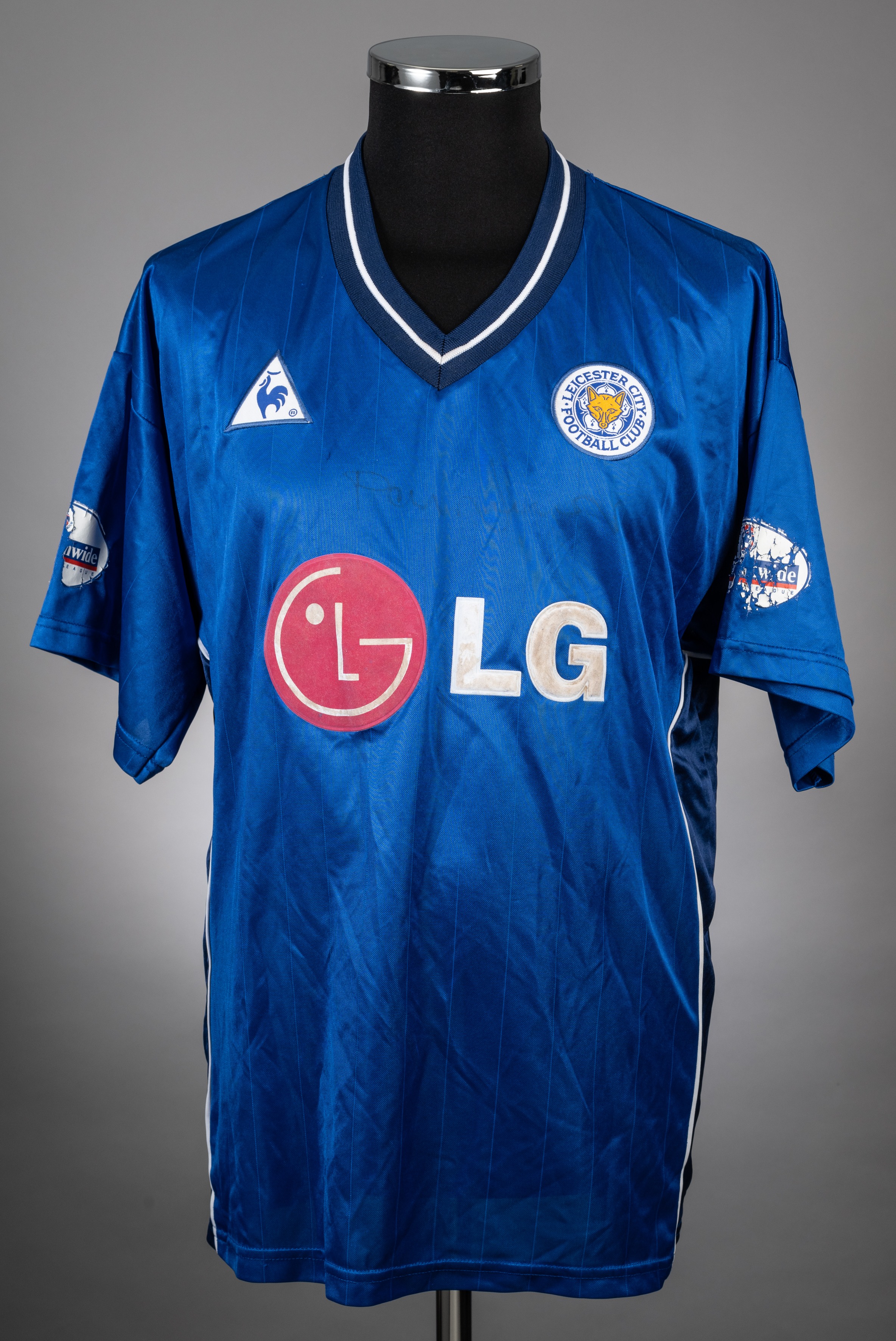 Paul Dickov blue No.22 Leicester City short-sleeved jersey, 2002-03, Le Coq Sportif, with v-neck collar and embroidered cloth badge inscribed LEICESTER CITY FOOTBALL CLUB, the reverse lettered DICKOV, the front of the shirt with faded Paul Dickov autograph, the sleeves with Nationwide Football League flashes Shirt in used condition, autographed faded and sleeve flashes poor