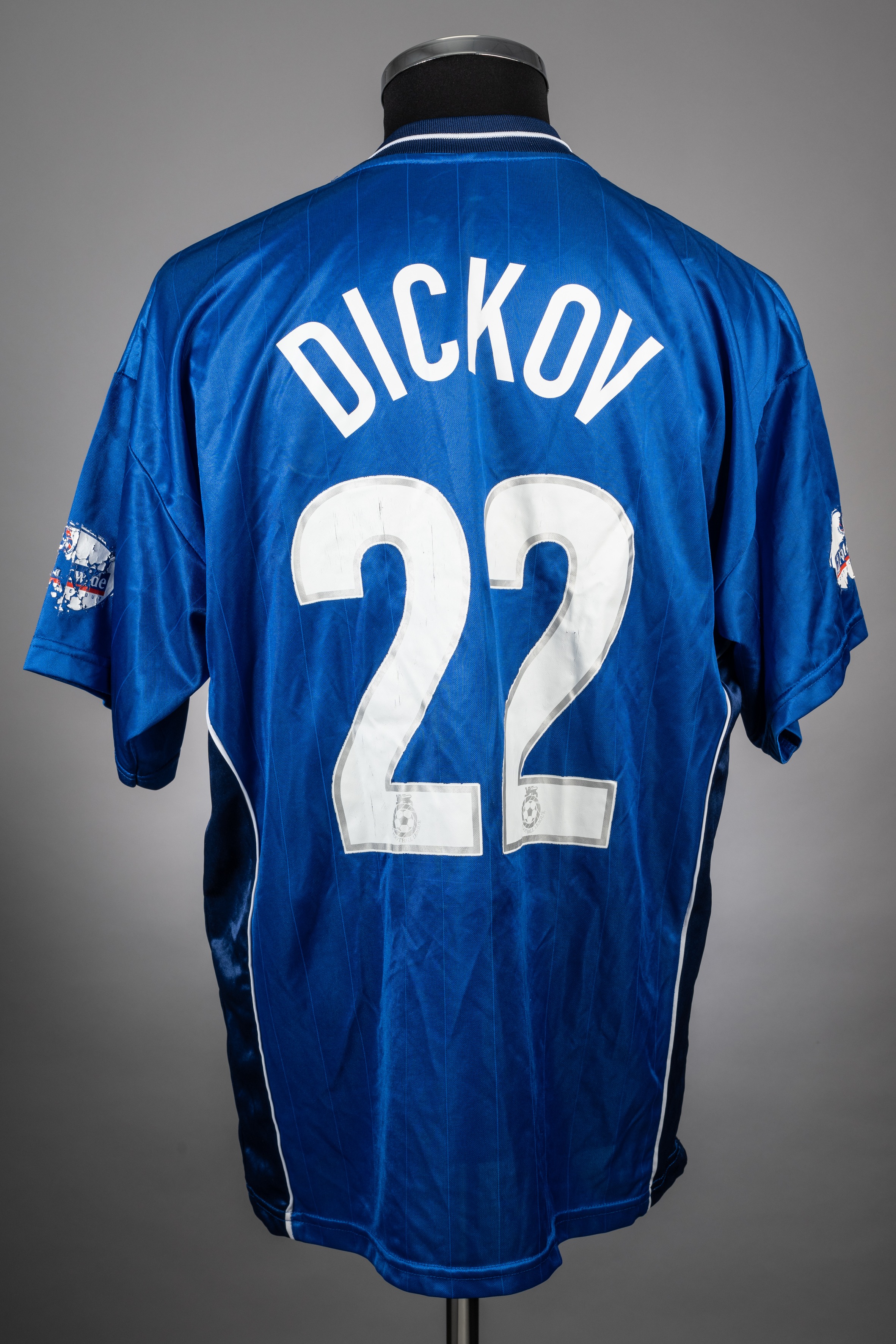 Paul Dickov blue No.22 Leicester City short-sleeved jersey, 2002-03, Le Coq Sportif, with v-neck collar and embroidered cloth badge inscribed LEICES