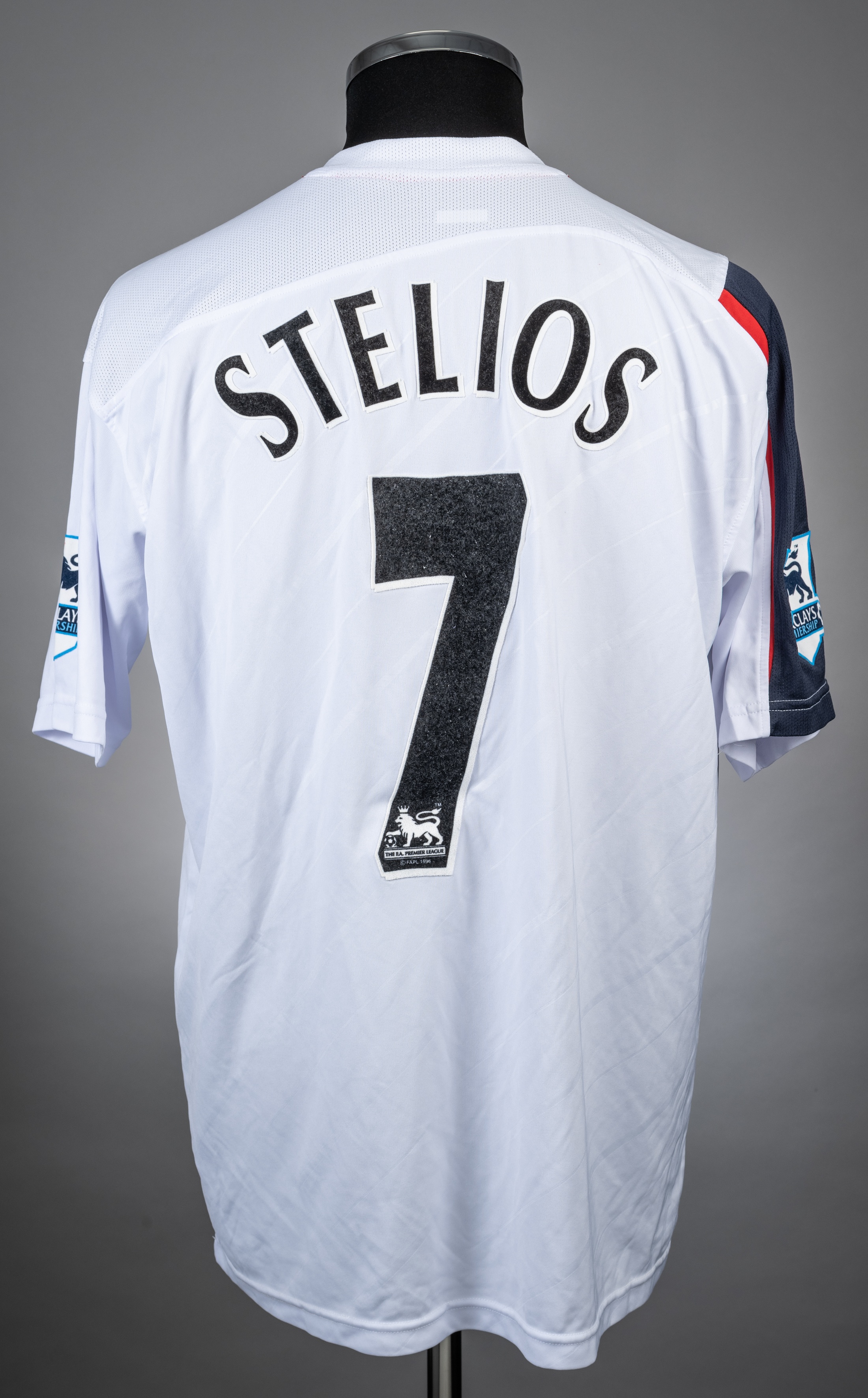 Stelios Giannakopoulos white No.7 Bolton Wanderers short-sleeved jersey, 2005,07, Reebok, L, with crew-neck collar and printed badge, the reverse lettered STELIOS, the sleeves with Barclays Premiership flashes