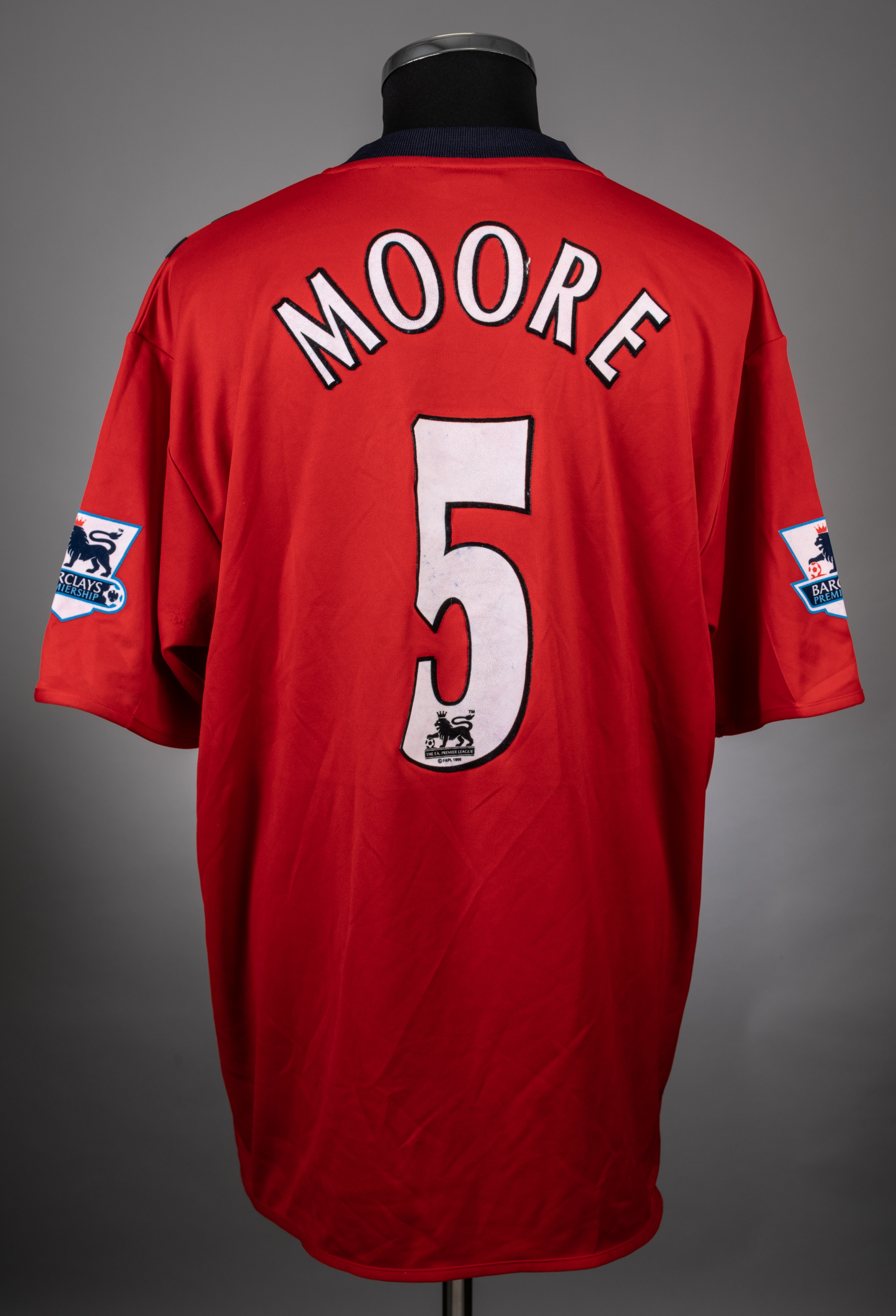 Darren Moore red and blue No.5 West Bromwich Albion short-sleeved jersey, 2004-06, Diadora, XXL, 3rd kit, with crew-neck collar and embroidered cloth badge, the reverse lettered MOORE, the sleeves with Barclays Premiership flashes