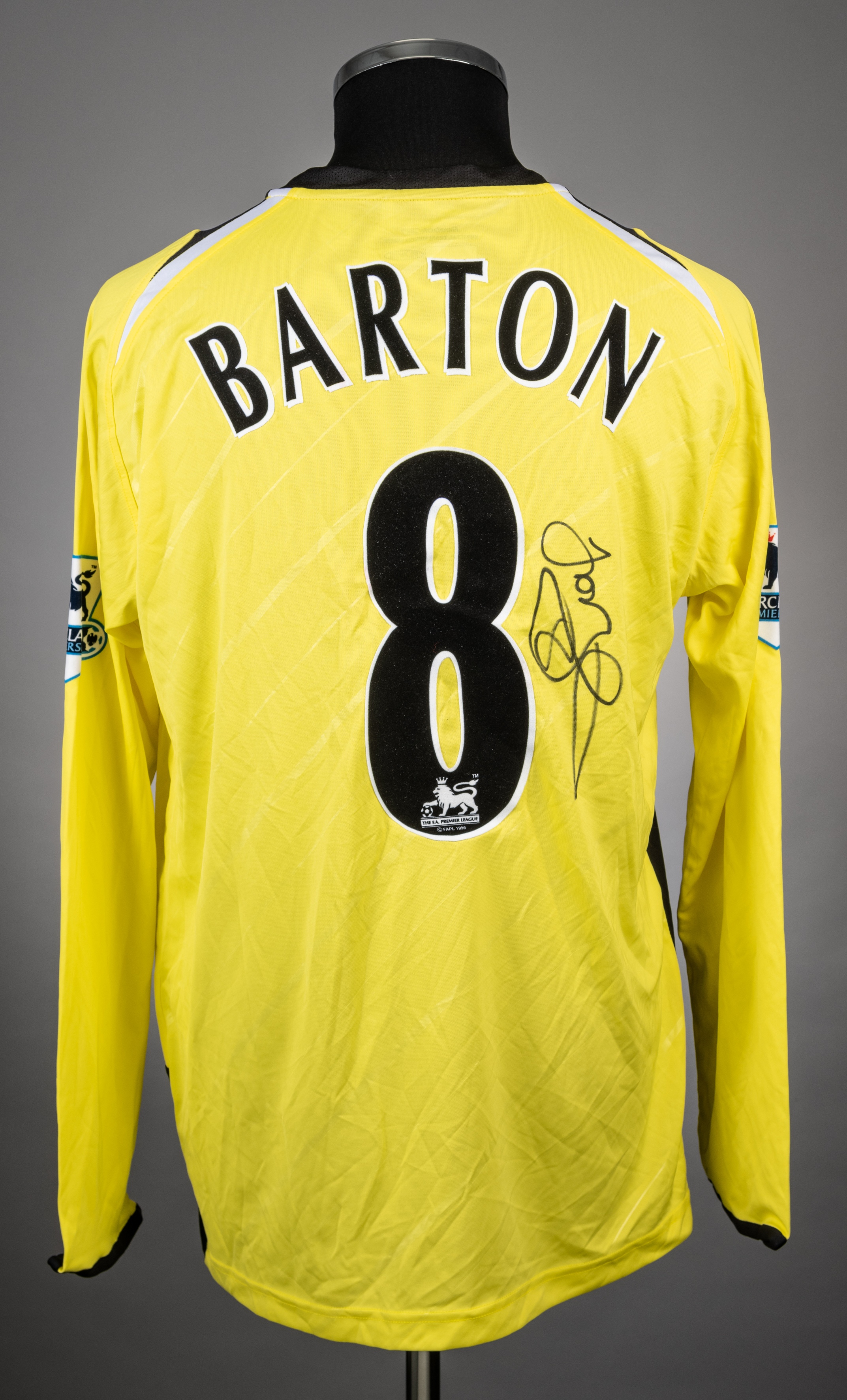 Joey Barton yellow, black and white No.8 Manchester City long-sleeved jersey, 2006-07, Reebok, M, 3rd kit, with crew-neck collar and printed badge, the reverse lettered BARTON, the reverse also autographed by Joey Barton, the sleeves with Barclays Premiership flashes