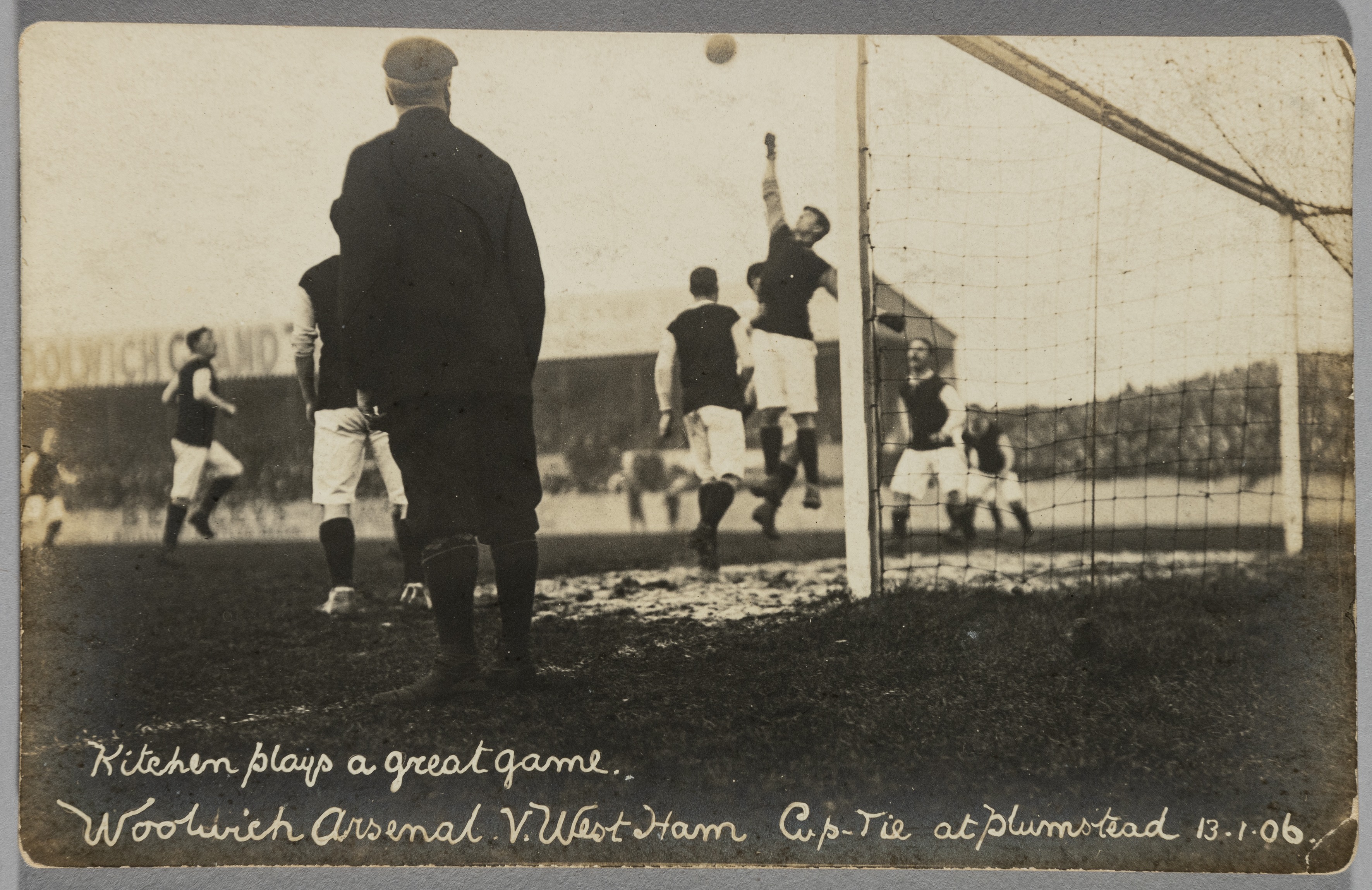Woolwich Arsenal v West Ham United cup tie at Plumstead, 13th January 1906 black and white postcard, titled "Kitchen plays a great game", publisher Goldthorpe, Photo Chemist, Plumstead Wear to corners and creased, this fixture resulted in a 1-1 draw
