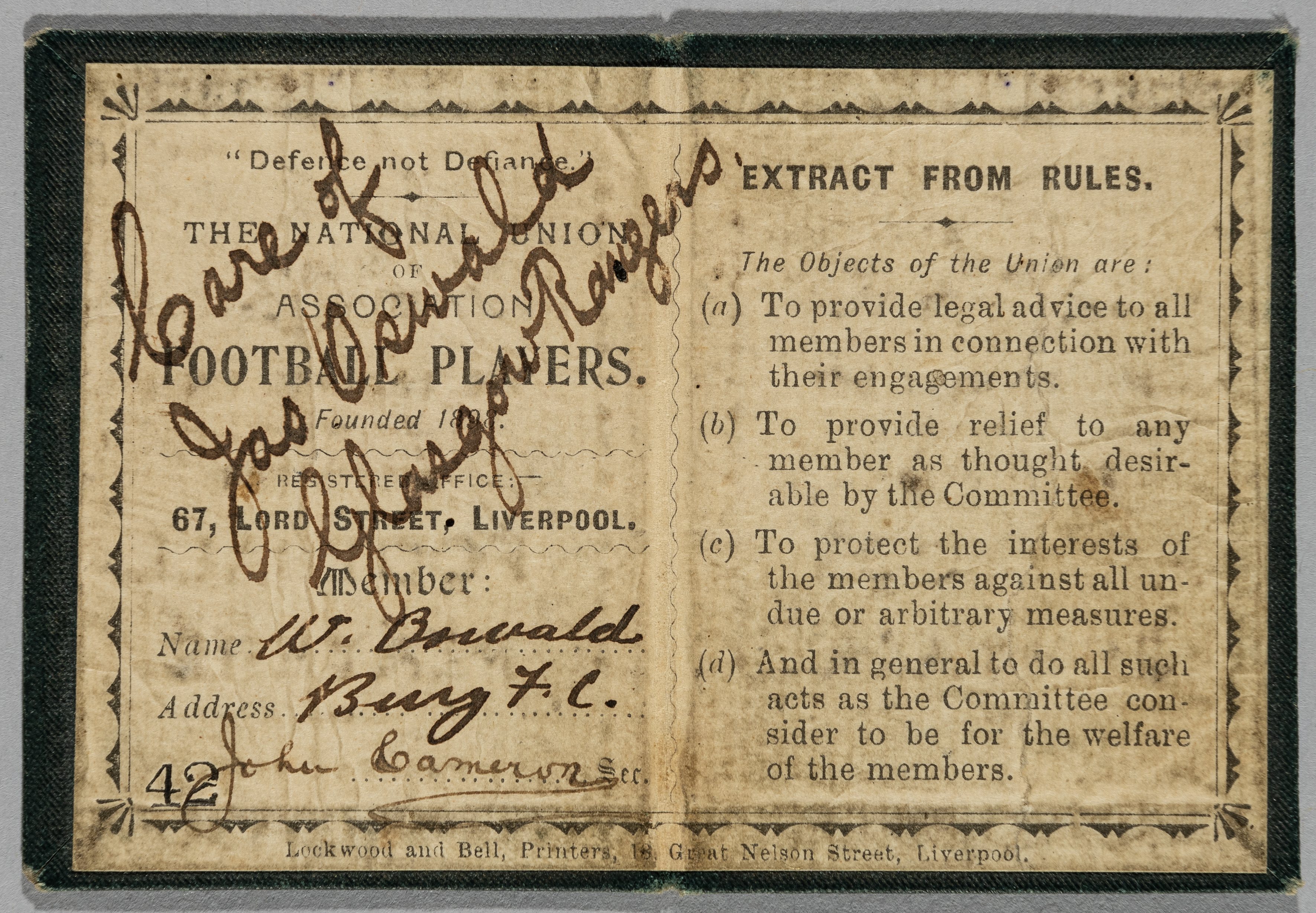 Football in 1898 the first attempt to form a Players Union took place small membership card no.42 for National Union of Association Football Players issued to W Oswald Bury with note care of Jas Oswald Glasgow Rangers. The movement was started by Everton players and secretary was John Cameron, signed card, Cameron moved to Tottenham winning FA c/finals. Others who were members were Derby, Aston Villa, Man. City, it folded in 1901 and in 1907 the current players union was formed. Rare item of football history