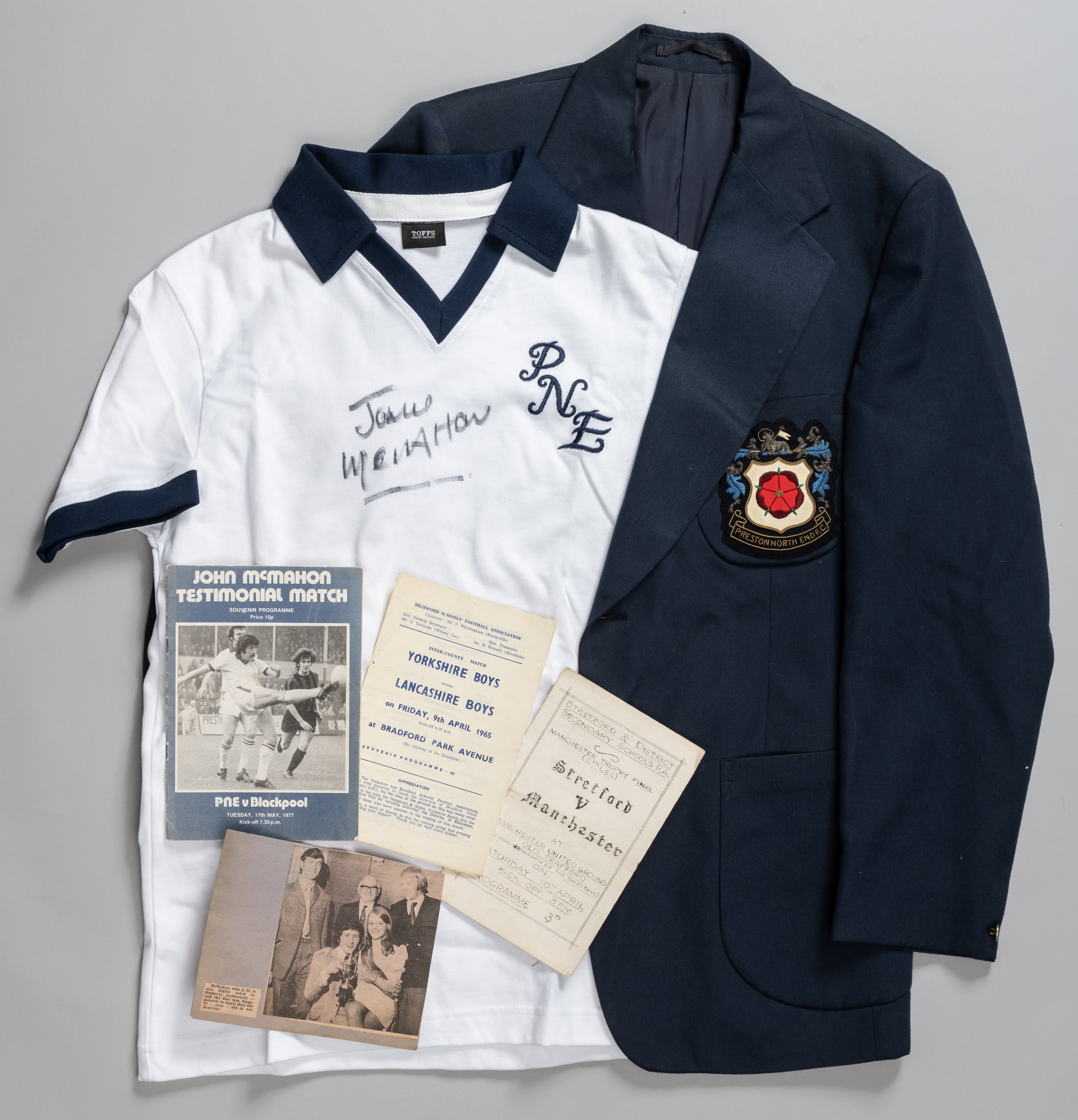 John McMahon's official Preston North End club blazer, with embroidered badge inscribed PRESTON NORTH END F.C., TOFFS replica Preston North End short-sleeved shirt autographed by John McMahon, Preston North End v. Blackpool, John McMahon Testimonial Match programme, 17th May 1977, Stretford v. Manchester, Manchester Trophy Final, 2nd Leg, 10th April, Yorkshire Boys v. Lancashire Boys, Inter-County match programme, 9th April 1965, (5)