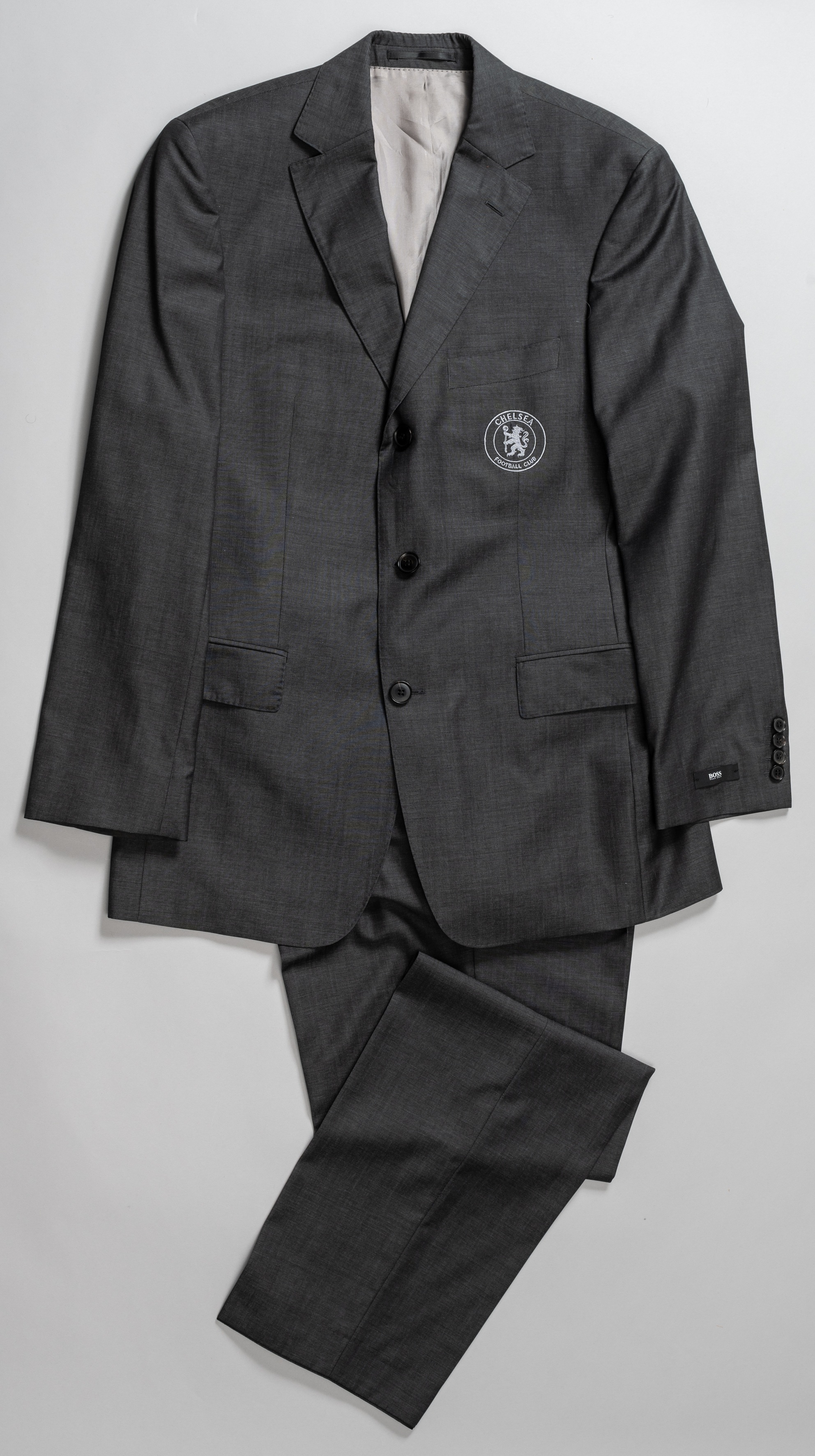 A charcoal grey 2007 Chelsea F.A. Cup final two-piece suit by Hugo Boss, with embroidered badge inscribed Chelsea Football Club, size 48, believed t