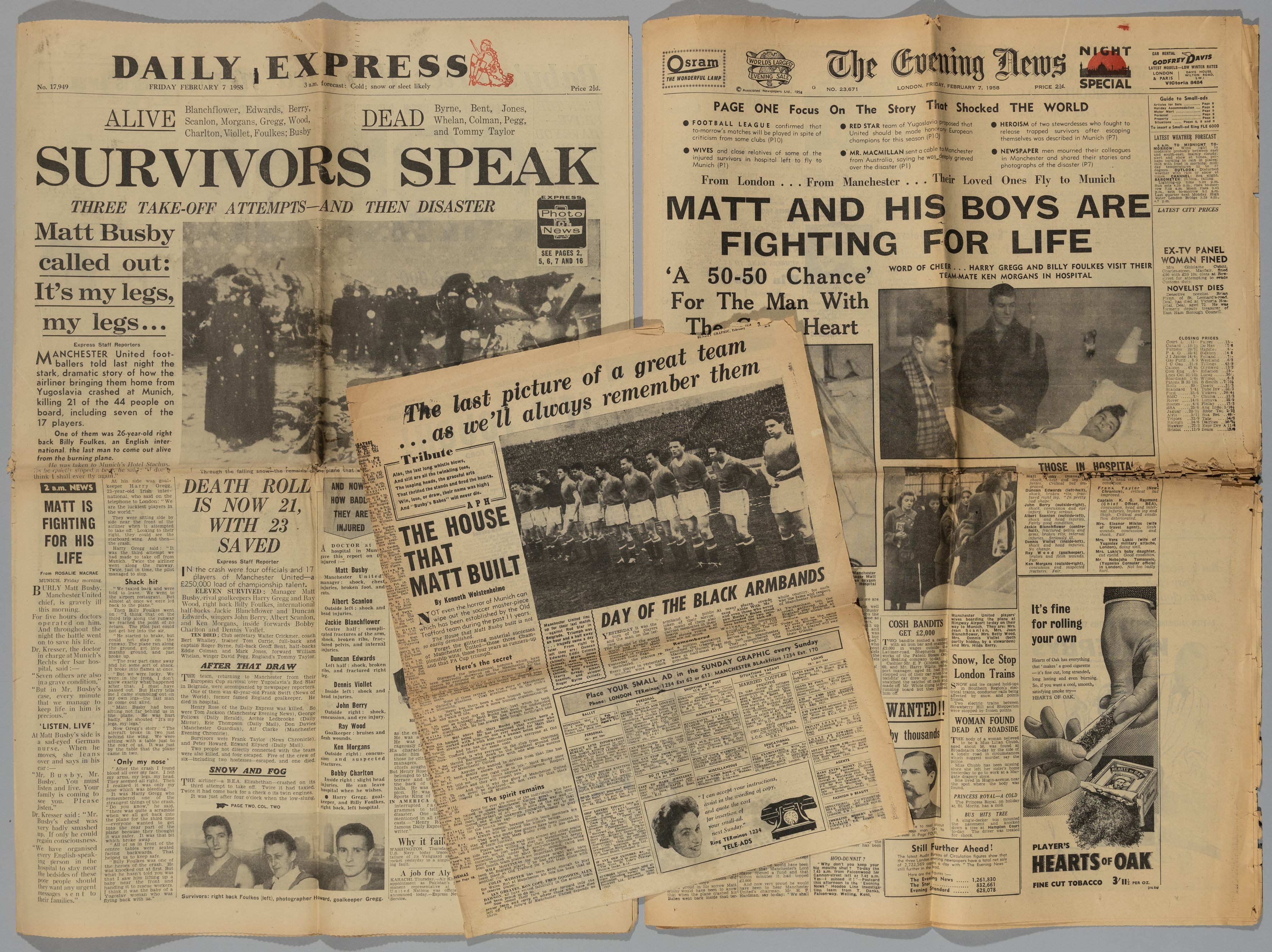 Two newspapers relating to the 1958 Manchester United Munich Air Disaster dated February 7th 1958 (the day after the crash)