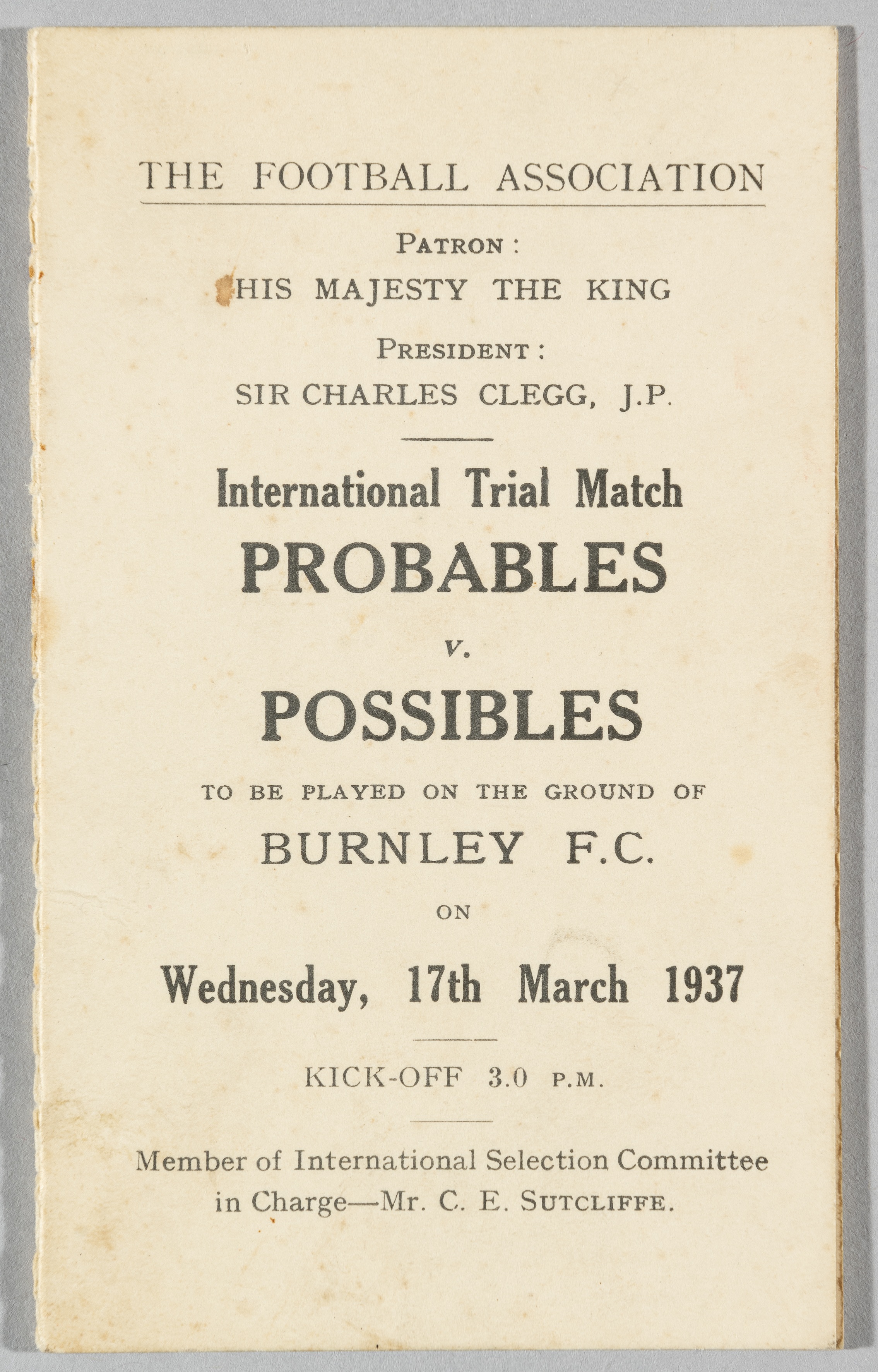 Itinerary for the Trial match Probables v Possibles, dated 17th March 1937, with both teams listed