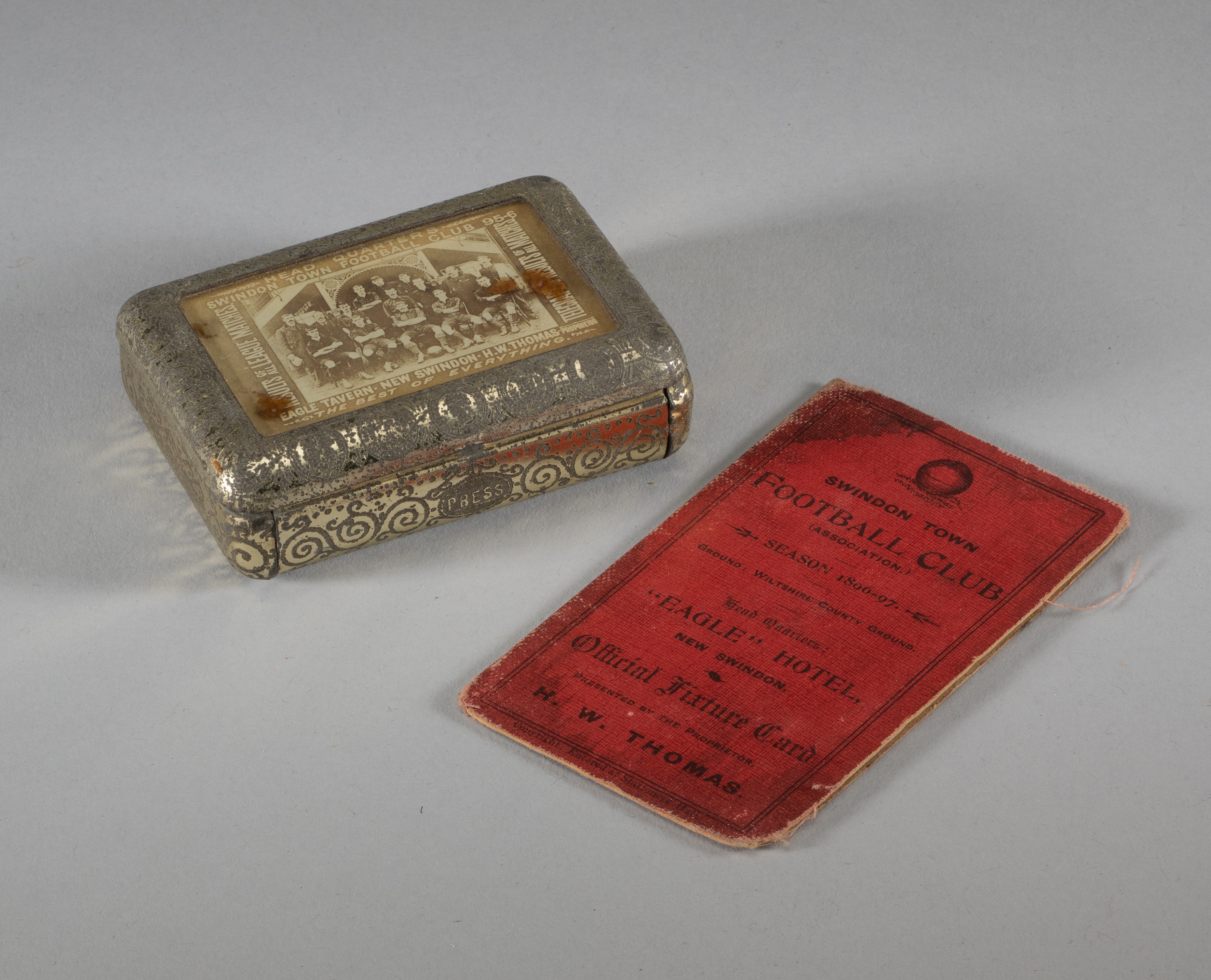 Victorian snuff box featuring a photographic portrait of Swindon Town Football Club in season 1895-96, the sepia-toned photo set into the lid under glass, being an advertisement piece for the East Tavern, New Swindon, proclaiming to be Headquarters of the Football Club, the box in engraved gilt-metal, hinged lid, 6 by 8cm., marks to photo and wear to box; sold together with an official fixture card published by the Eagle Hotel, New Swindon, for season 1896-97 (2)