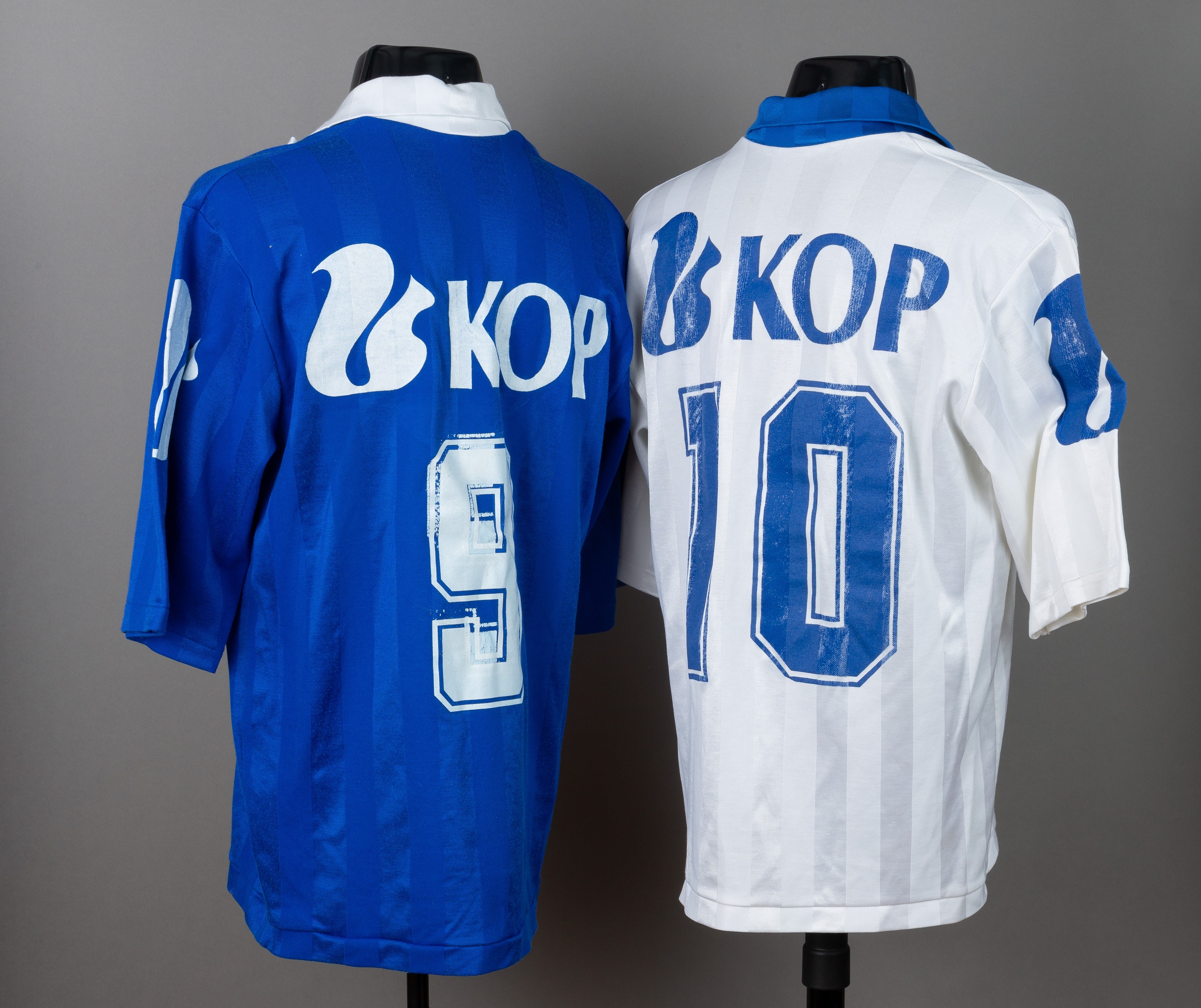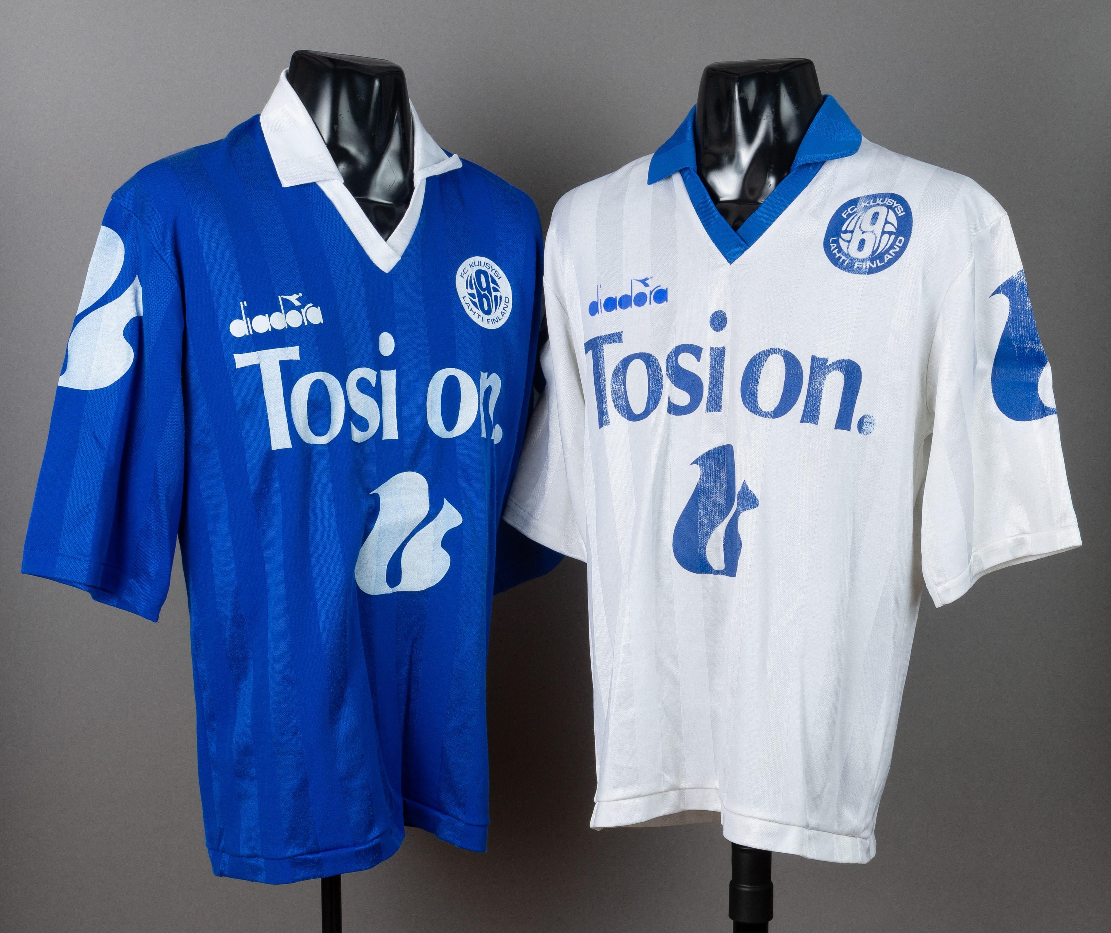 Two Reading Npower Championship play-off final jersey's v Swansea City AFC at Wembley, 30th May 2011, both by Puma with NPOWER FOOTBALL LEAGUE sleeve badges club crest and sponsor logo, embroidered NPOWER CHAMPIONSHIP PLAY-OFF FINAL READING FC V SWANSEA CITH AFC 30TH MAY 2011 - WEMBLEY STADIUM, the first Ben Hamer no.21 goalkeeper's long-sleeved jersey, reverse lettered HAMER, the second Alex Pearce no.26 short-sleeved jersey, reverse lettered PEARCE; sold together with Chris Haywood white Baltimore Blast no.8 jersey, circa 1990s, Bike, short-sleeved with BIKE AMERICA'S SOCCER CLUB sleeve badge, club crest and sponsor logo, reverse lettered HAYWOOD and two FC Kuusysi Lahti Finland jerseys, circa 1989, both by Diadora, with club crest and sponsor logo's, the first a blue no.9 short-sleeved jersey and the second a white no.10 short-sleeved jersey, applied transfers damaged and sticky, it is believed the no.10 jersey was Mike Belfield the English striker, (5) Swansea City AFC defeated Reading 4-2, Alex Pearce was a unused substitute and Ben Hamer did not feature in the 2011 play-off final.