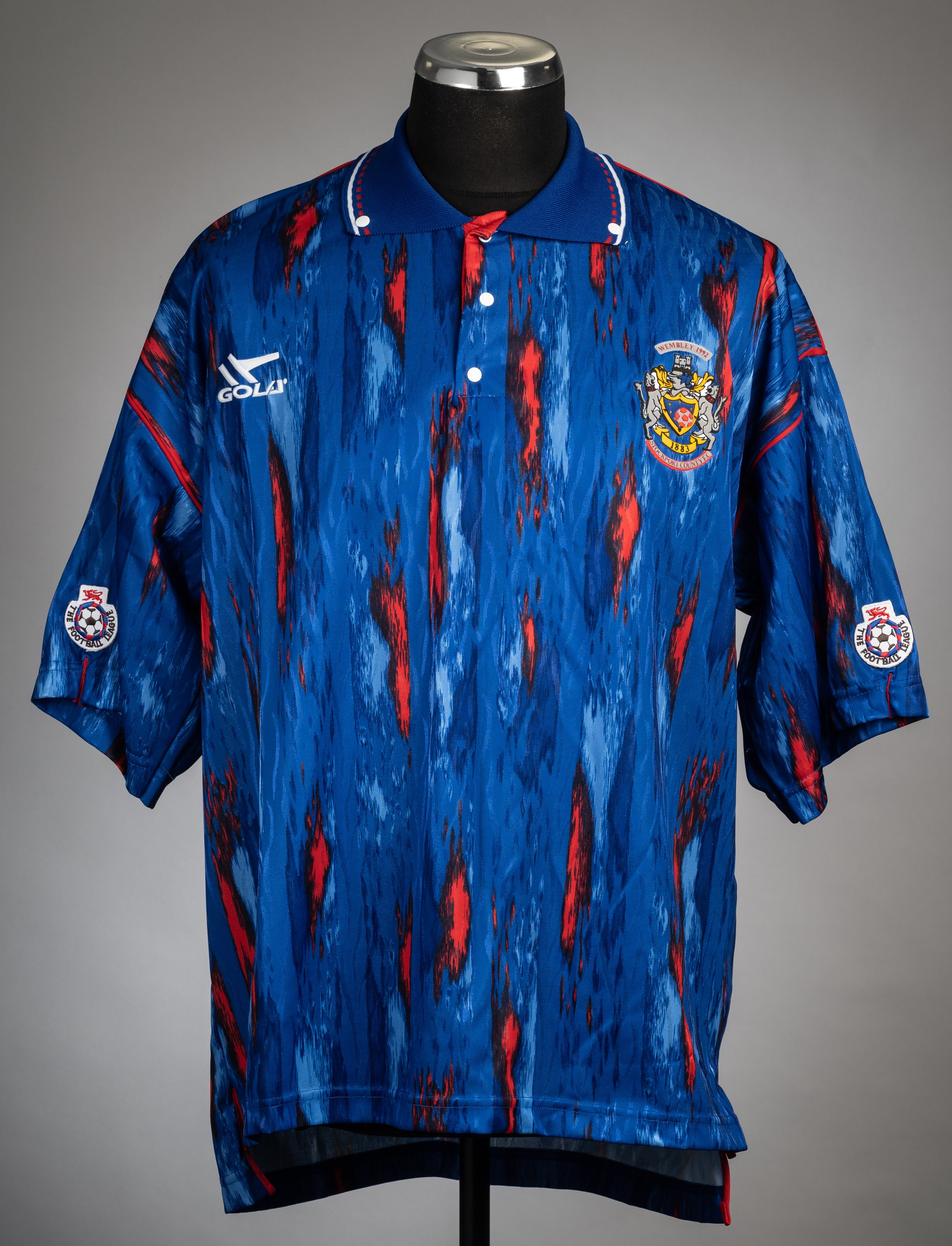 Jim Gannon blue & red Stockport County no.7 Associate Members' Autoglass Trophy Cup final jersey v Stoke City at Wembley, 16th May 1992, Gola, short-sleeved with THE FOOTBALL LEAGUE sleeve badges, WEMBLEY 1992 badge, club crest and sponsor logo, reverse numbered 7 Stoke City defeated Stockport County 1-0. Jim Gannon played with Stockport during 1990-2000, making 383 appearances scoring 52 goals.