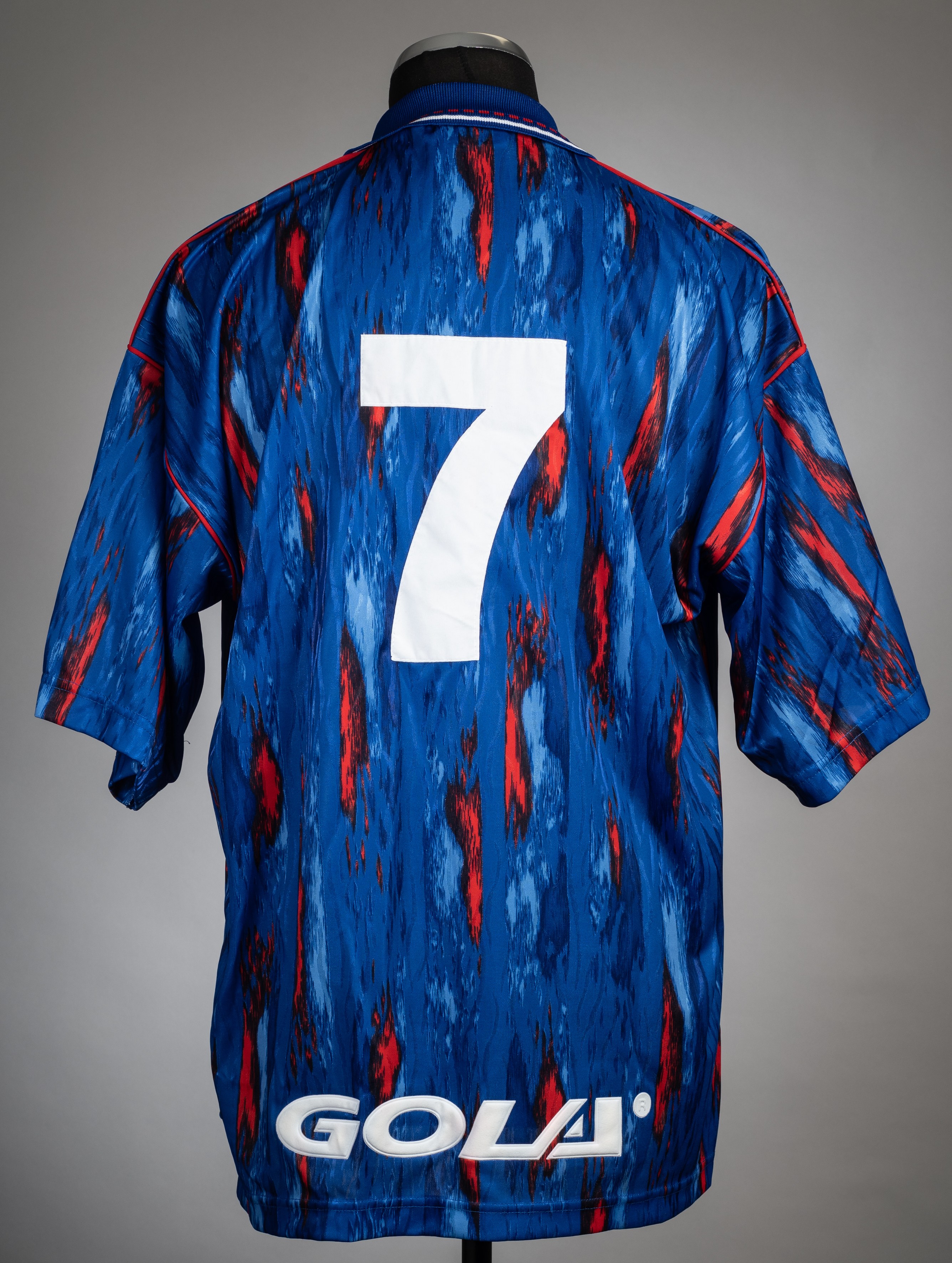 Jim Gannon blue & red Stockport County no.7 Associate Members' Autoglass Trophy Cup final jersey v Stoke City at Wembley, 16th May 1992, Gola, short-