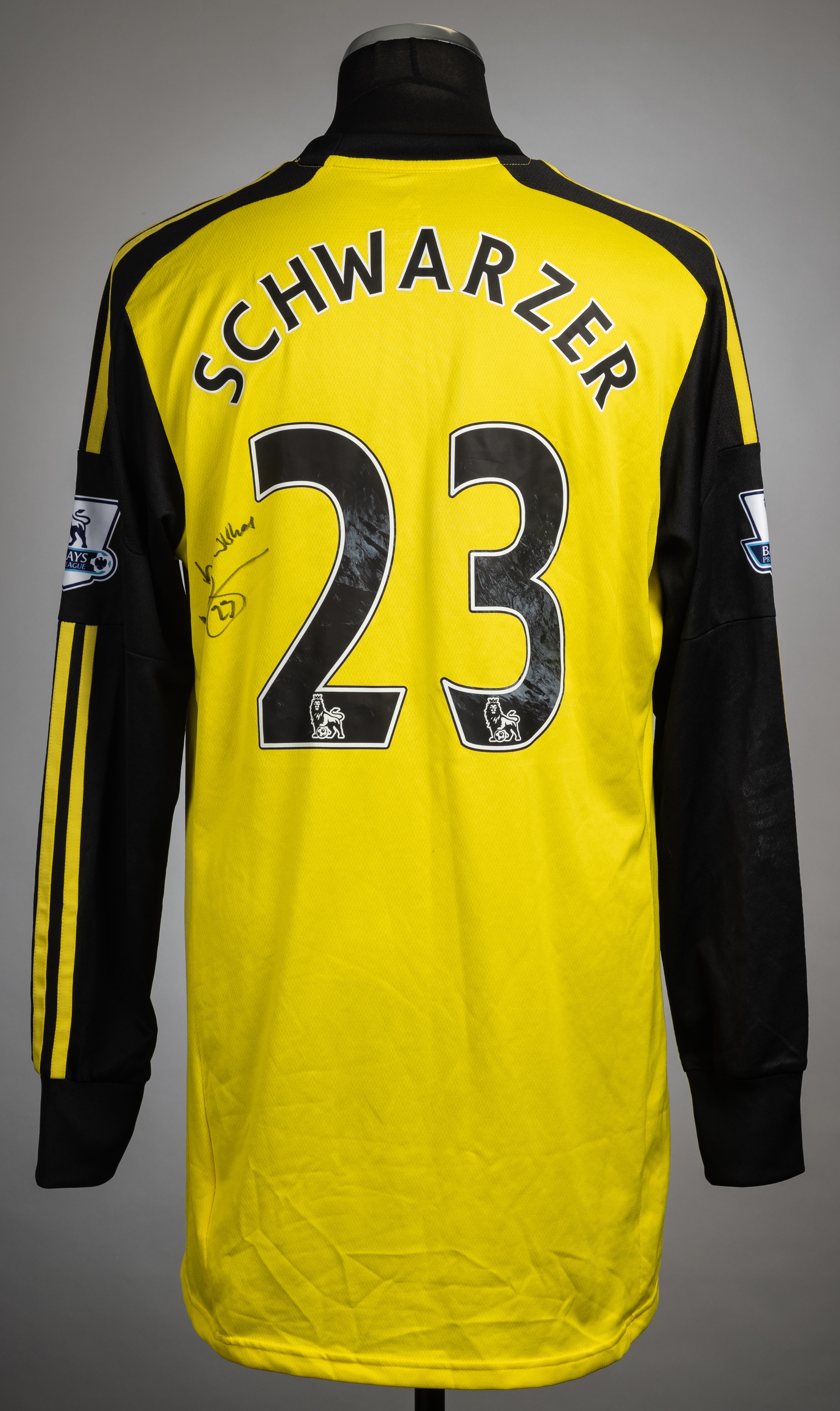 Mark Schwarzer signed yellow and black Chelsea no.23 goalkeeper's home jersey, season 2013-14, Adidas, long-sleeved with BARCLAYS PREMIER LEAGUE sleeve badges, club crest and sponsor logo, reverse lettered SCHWARZER, signed in black marker pen on reverse Mark Schwarzer played with Chelsea during 2013-15 making four appearances.