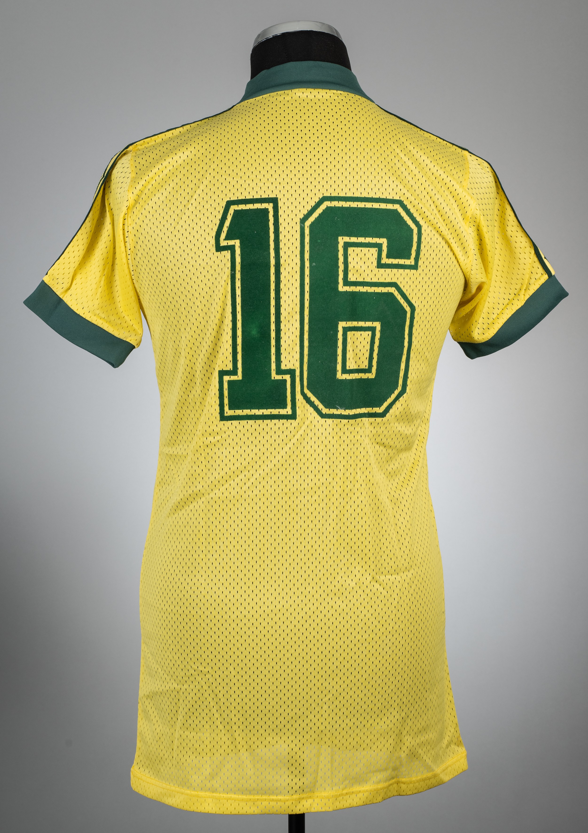 Phil O'Connor yellow and green Australia no.16 jersey v England, played at Sydney Cricket ground, 31st May 1980, Umbro, short-sleeved with national emblem badge, reverse numbered 16, signed to front in black marker pen by England substitute Kevin Reeves, size 38/40in. This jersey was exchanged after the match.