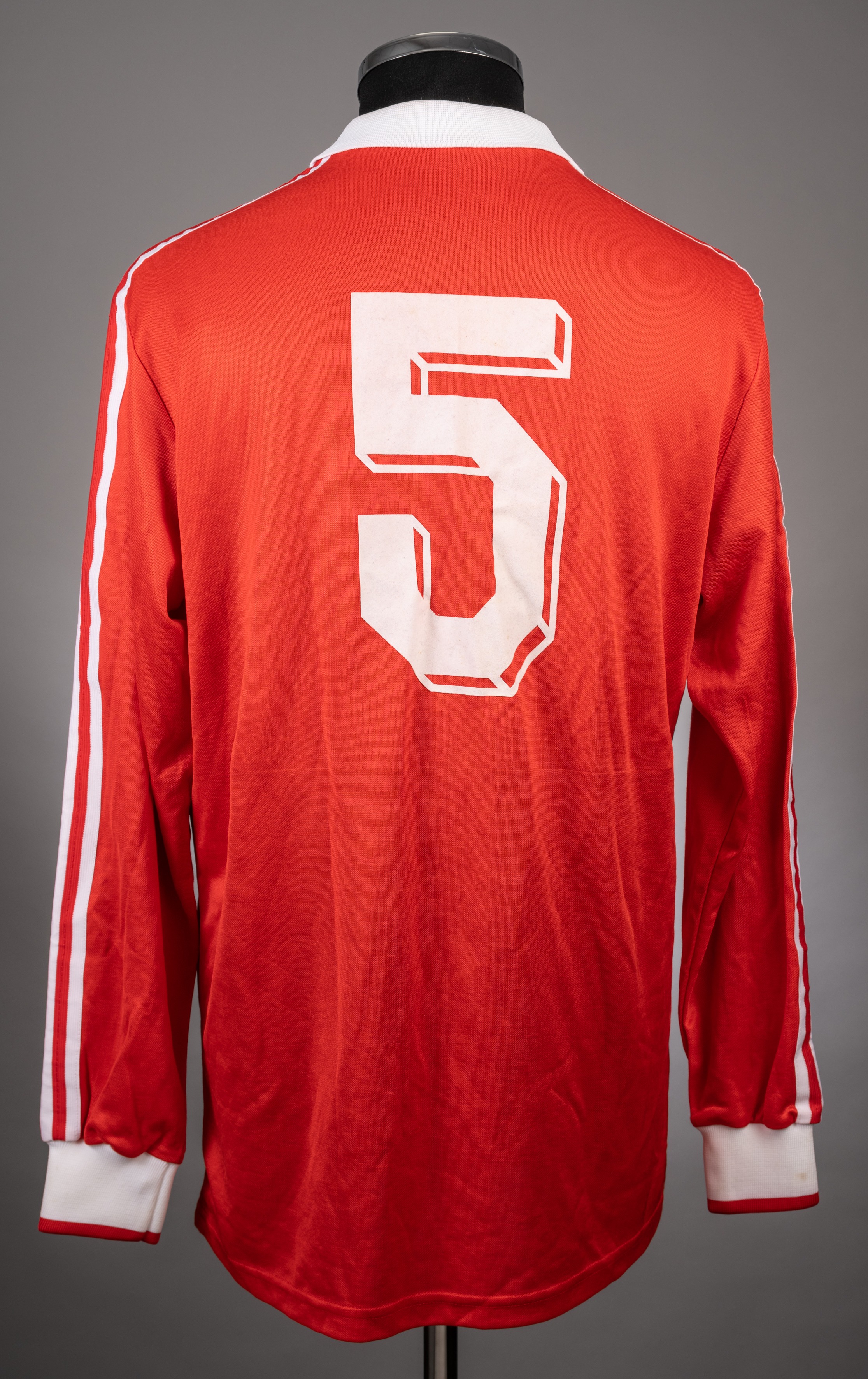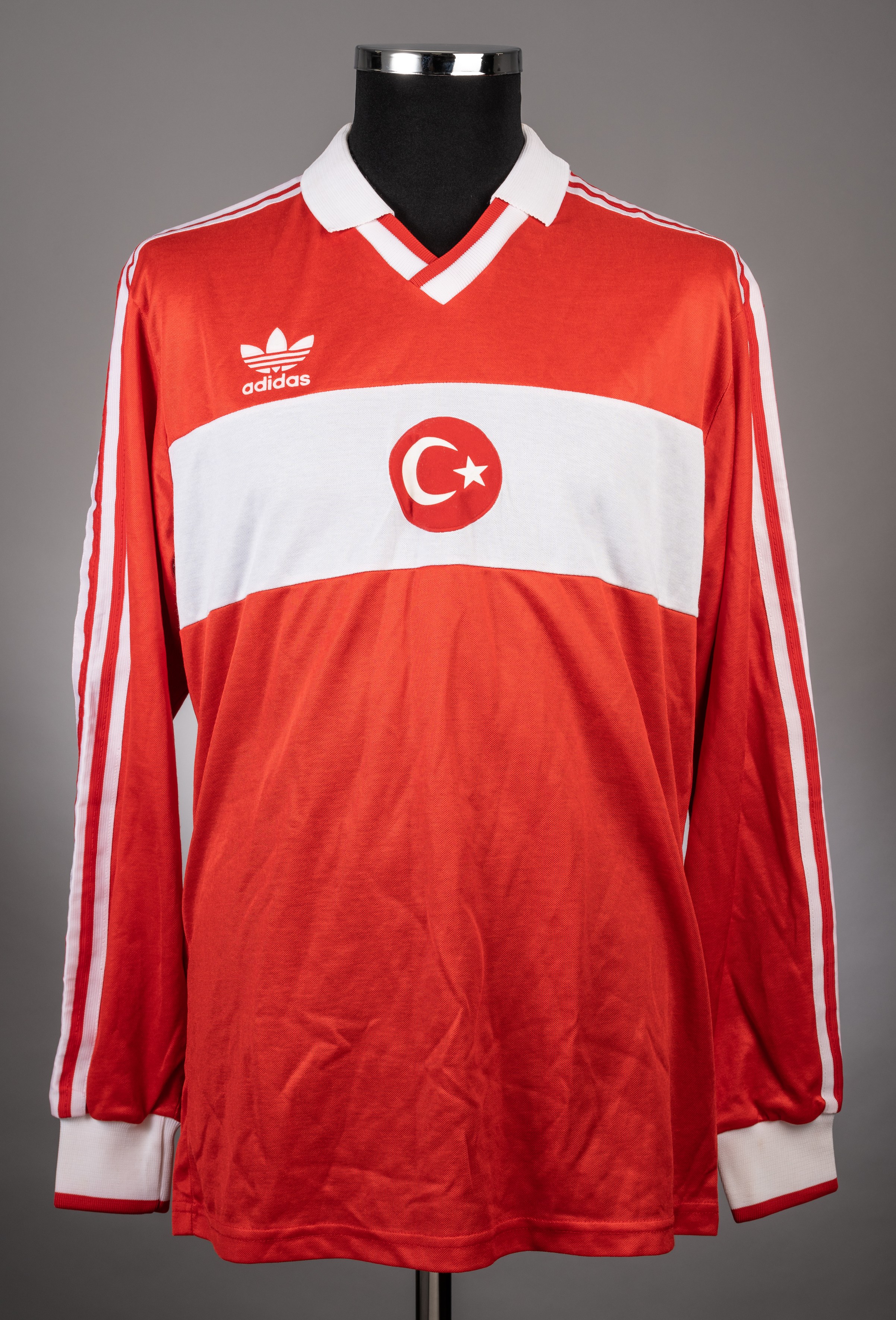 Red and white No.5 Adidas Turkey Away Jersey from 1987, this jersey is a long sleeved Adidas example with the Turkey national badge featured centrally on the front on a white central band. It bears the manufacturer trademark which is also in white. The back features the no.5 as well as a white collar and the customary manufacturer stripes which are also depicted in the same colour. The size is given as "5". The item is player issued and shows the general aging signs that would be reasonably expected from an item from this period. There are no visible signs of match wear, but the garment has been washed. At this time, the jersey no.5 was worn by both Riza Calimbay of Besiktas and Iskender Gunen of Trabzonspor. The identity of the player or game this was used in is unknown.