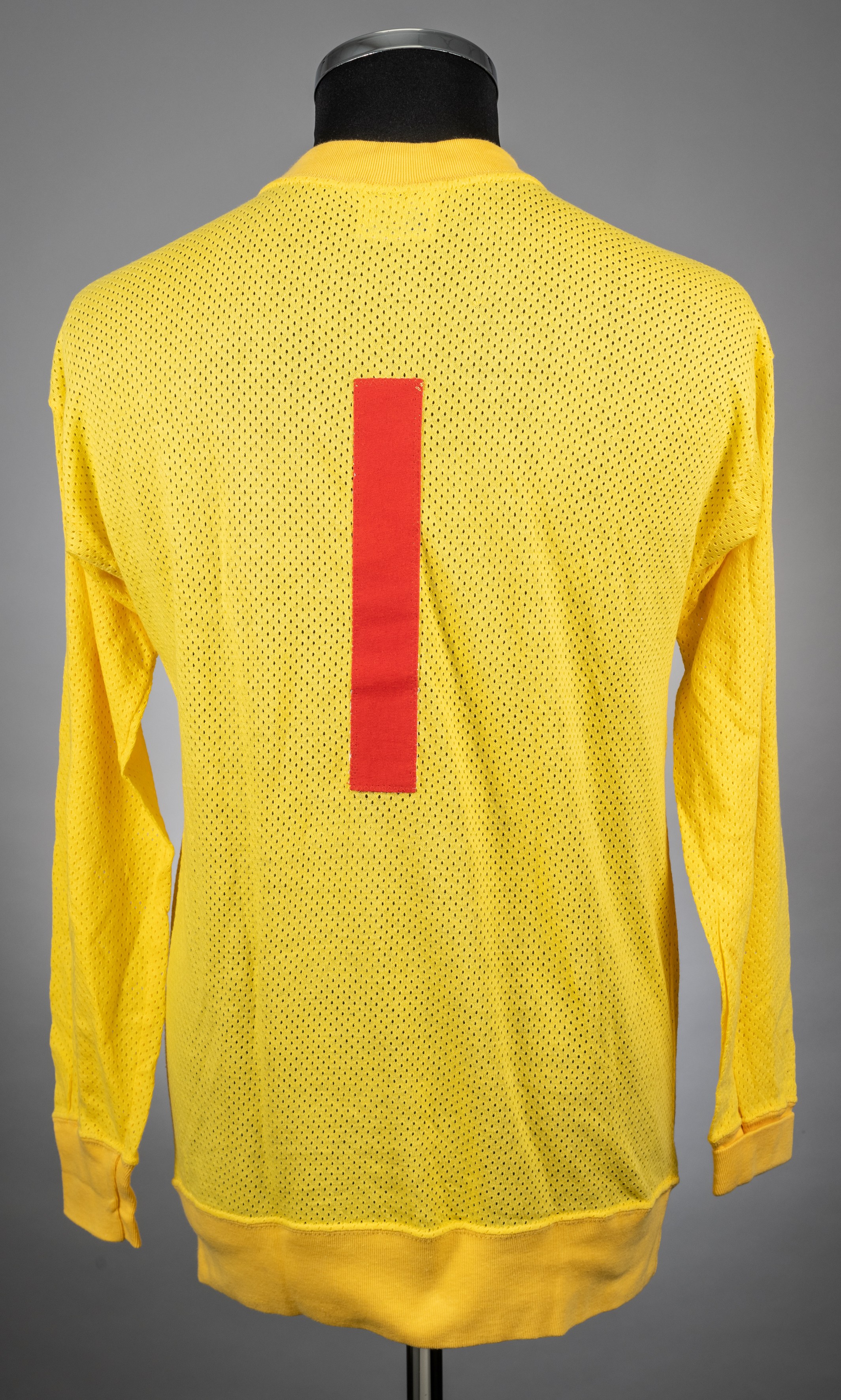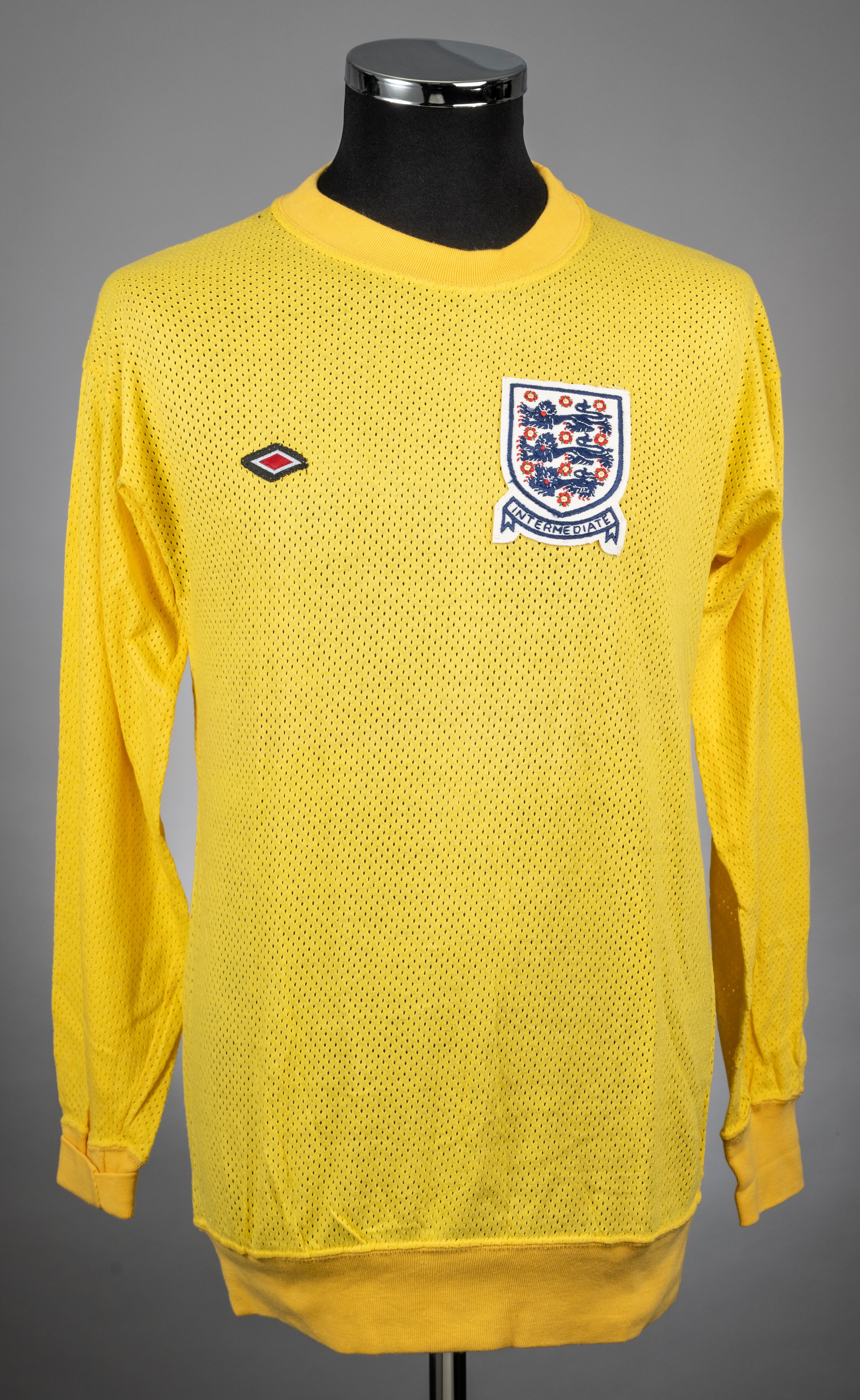 A yellow Airtex England Intermediate goalkeeper jersey, No.1, with crew-neck collar and embroidered three lion badge inscribed Intermediate, Umbro label, the reverse with red No.1
