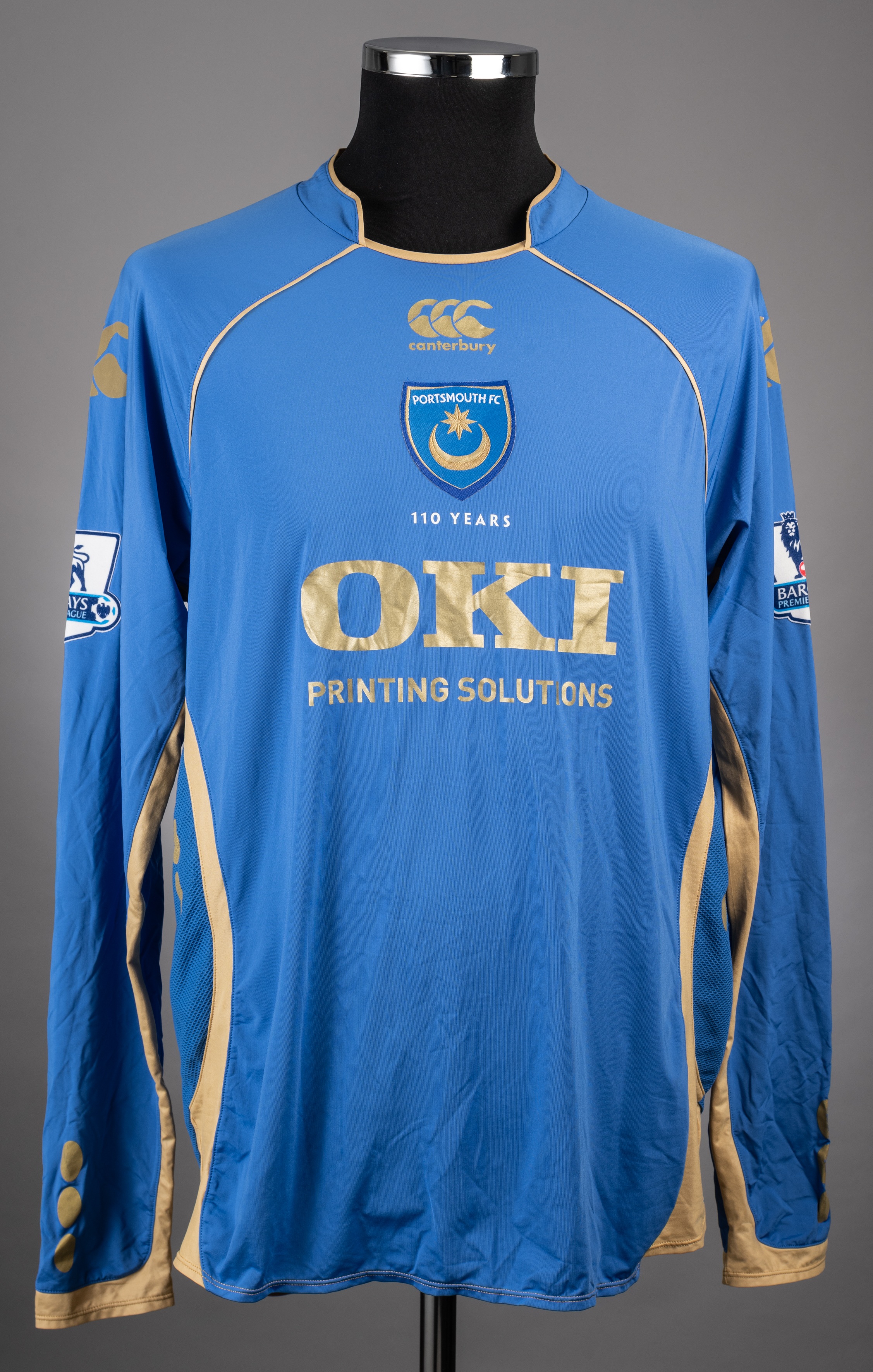 Peter Crouch blue No.9 Portsmouth signed home jersey. the item is a long sleeved example with the Barclays Premier League badges on both arms. The front has the Portsmouth Club badge mounted centrally with "110 Years" picked out beneath in white. the OKI PRINTING SOLUTIONS sponsor logo is below picked out in gold. The manufacturer CANTERBURY trademark is present above the Club crest. The back is lettered CROUCH in gold and it bears the number 9 in the same colour. The jersey has gold trim and is a size XL. It is also signed in black pen on the back by the player. The shirt shows signs of match wear and appears to have been washed at some point. It is in excellent condition. Peter Crouch played for Portsmouth from 2001- 2002 and 2008 - 2009 making a total of 75 appearances scoring 29 goals.
