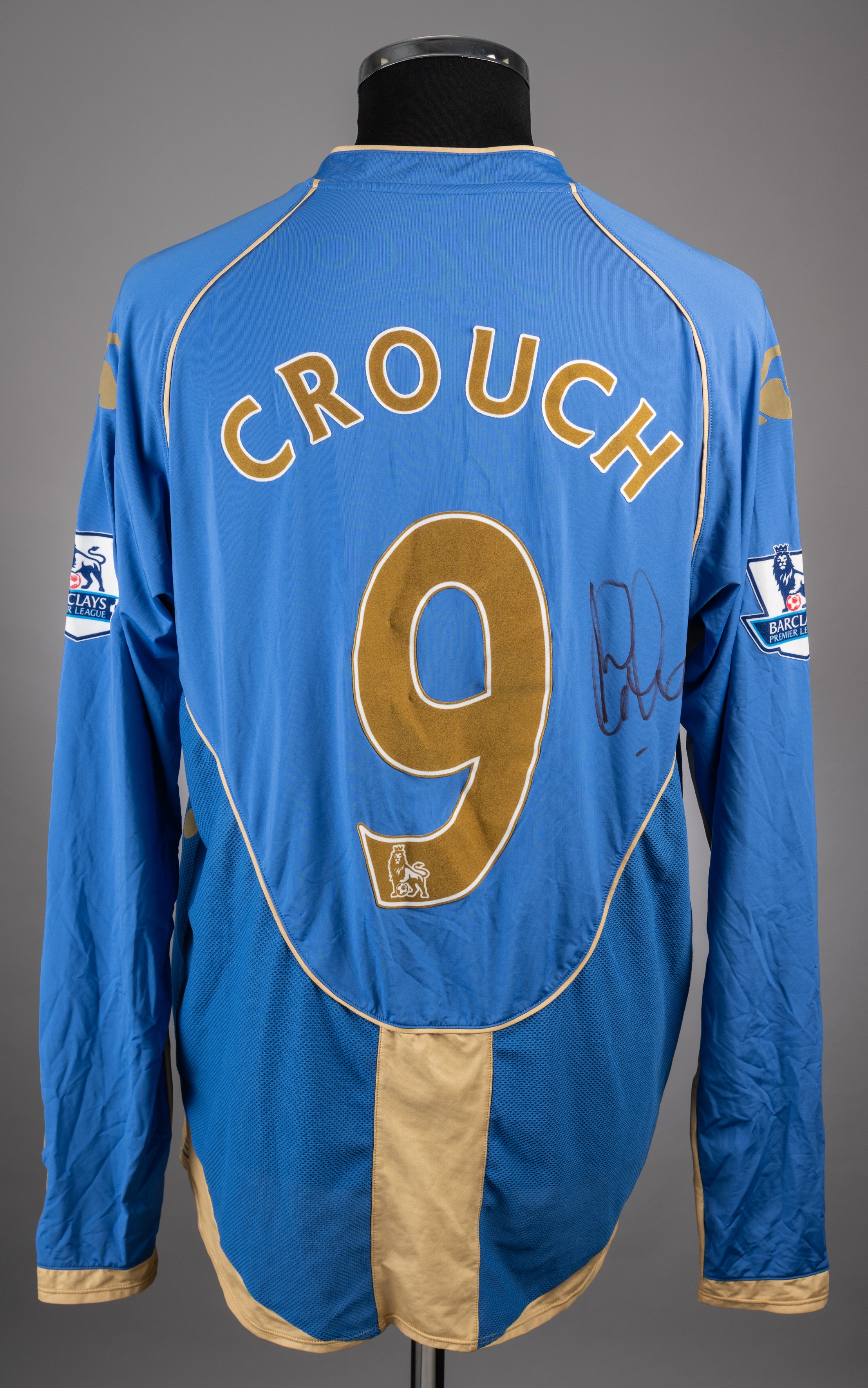 Peter Crouch blue No.9 Portsmouth signed home jersey. the item is a long sleeved example with the Barclays Premier League badges on both arms. The fr