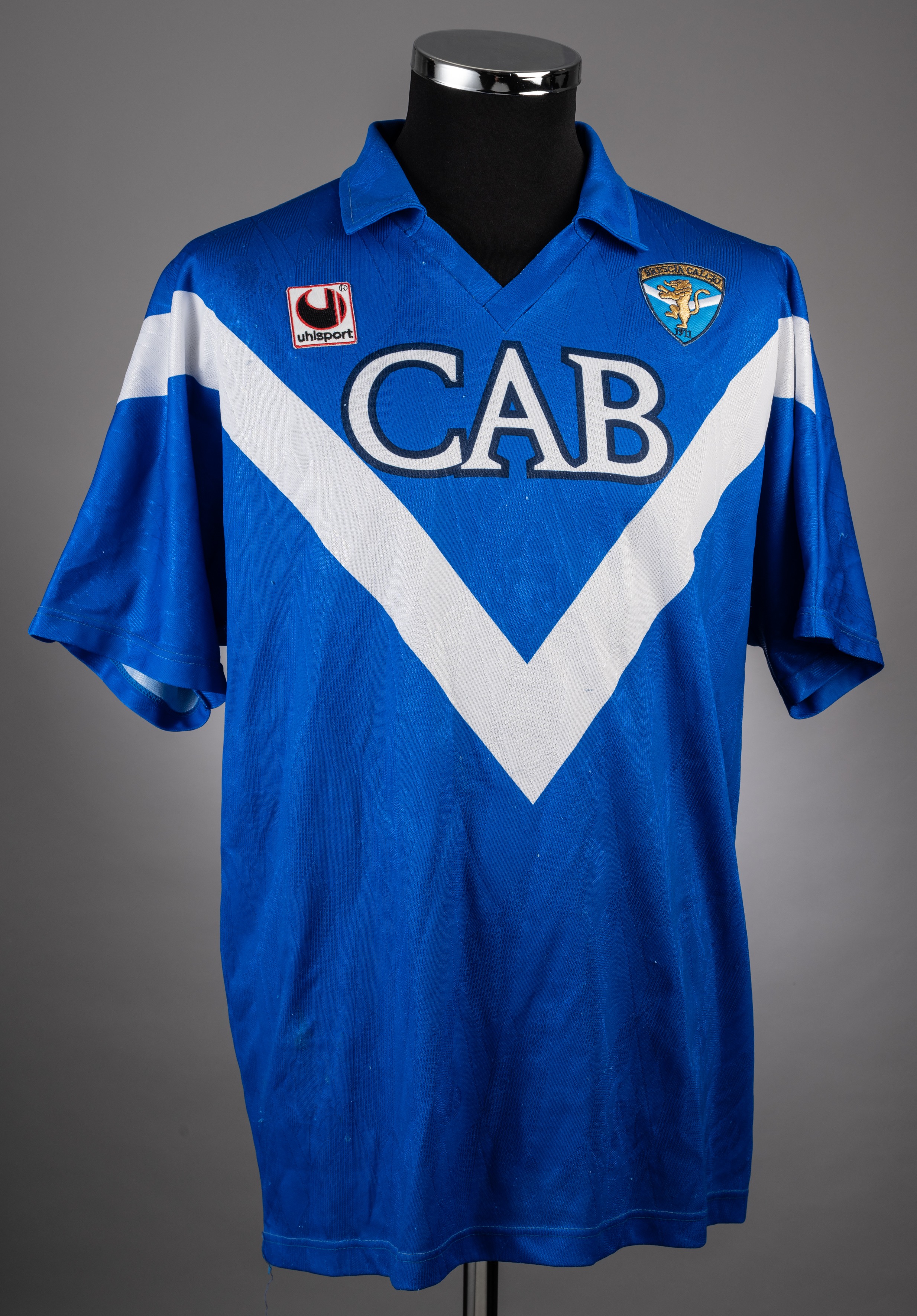 Pauolo Ziliani blue No.6 Brescia jersey worn in the Anglo Italian Cup game against Charlton Athletic on 12th October 1993 at the Stadio Mario Rigamonti and swapped with Linvoy Primus. the jersey is short sleeved and has the Brescia Calcio Club badge on the left side with the CAB sponsor logo central. The lettering and V shaped flash are both in white. The back bears the number 6 and it is a size XL. There are signs of age related wear and some bobbling to the material. It appears to have been washed. Charlton Athletic lost this group stage game by two goals to nil.